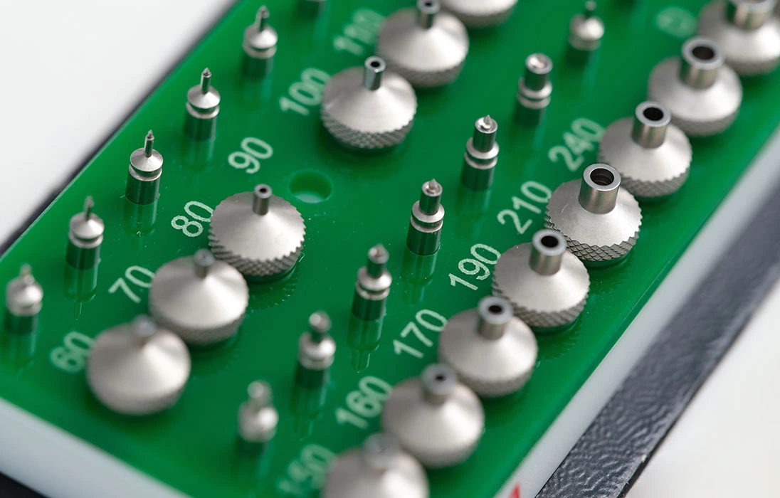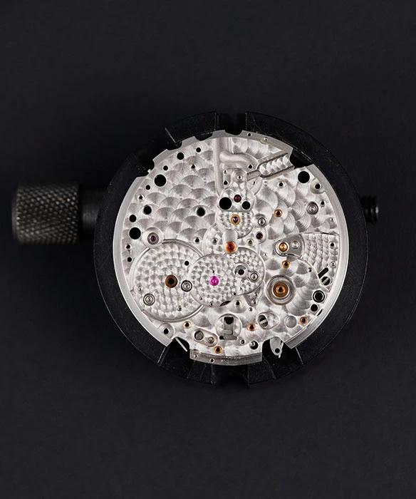 Um die Chronographenrückstellung zu prüfen, gibt es eine spezielle Form mit Drückern, in die das Werk gelegt und eine Testbrücke montiert wird. Nun werden der Stoppsekundenzeiger und der Stoppminutenzeiger aufgesetzt und der Chronograph gestartet, gestoppt und langsam zurückgestellt. Das Zusammenspiel von Rückstellhammer und Rückstellherz muss perfekt funktionieren. Auch das augenblicklich schaltende Datum wird kontrolliert.