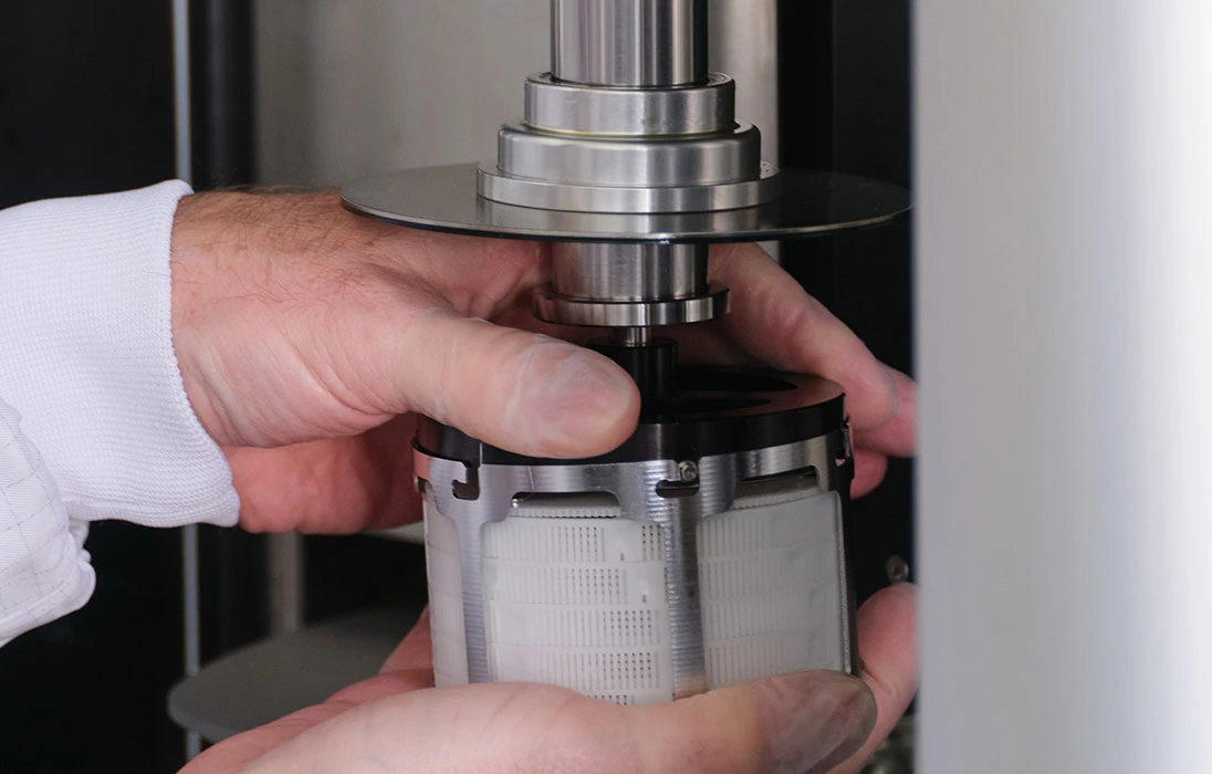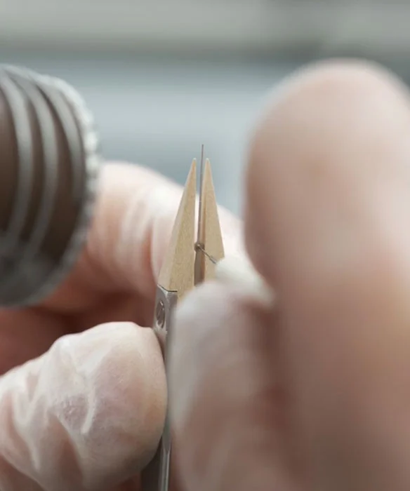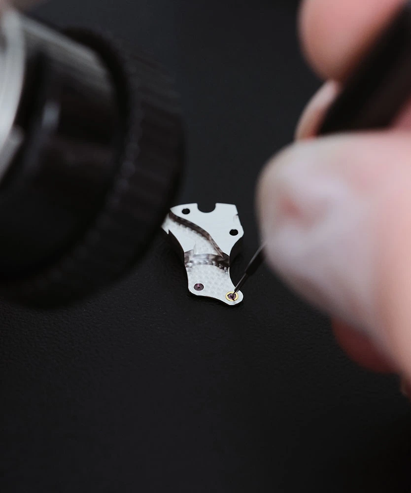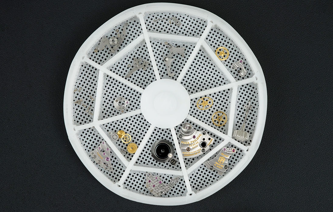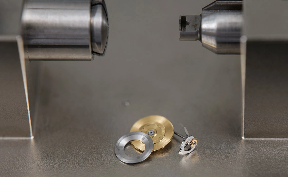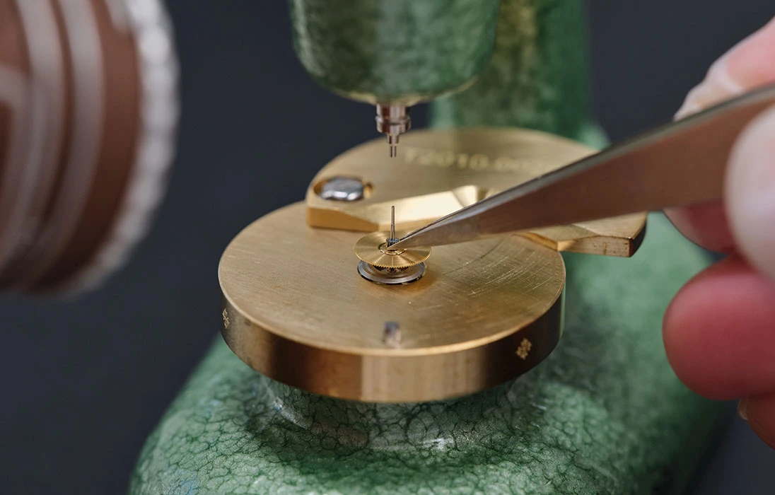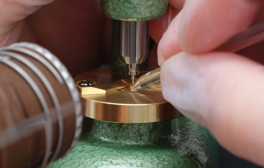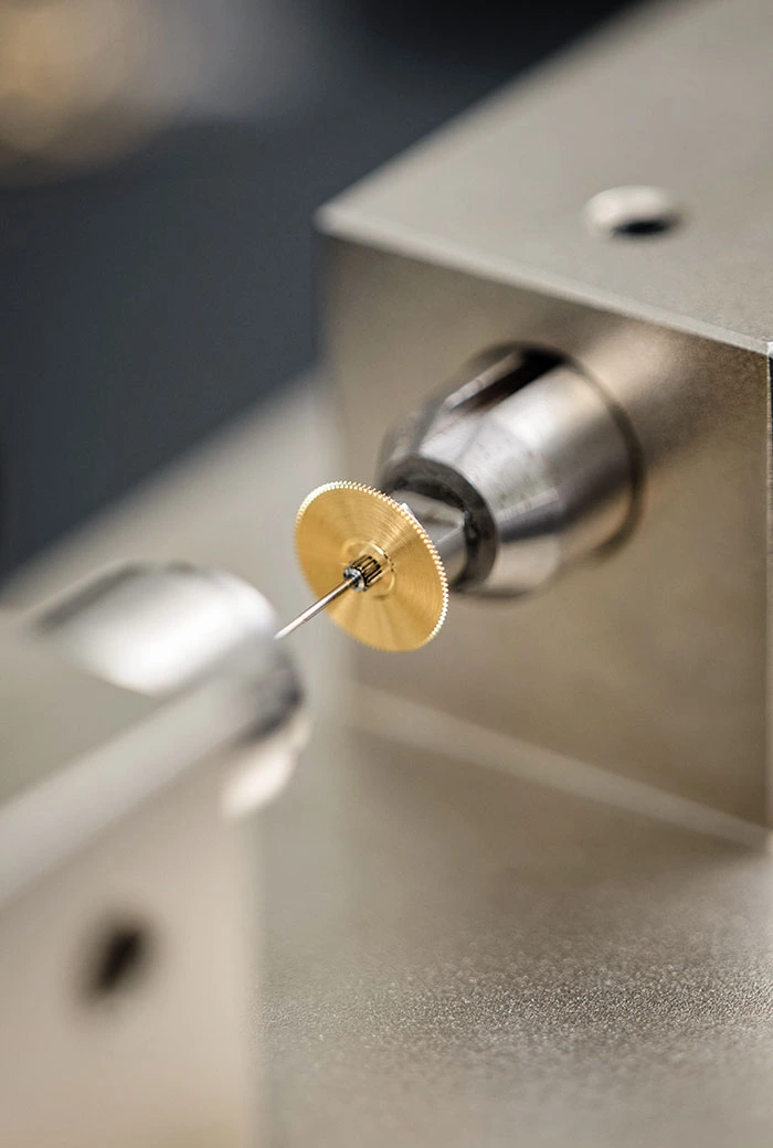 Sind alle Uhrwerkteile aus der Ultraschall-Reinigungsmaschine zurück, kann das Chronozentrumsrad wieder montiert werden. Dafür gibt es ein spezielles Montagewerkzeug von Patek Philippe, eine Messingform. Die Welle mit Nullstellherz und Trieb, die dreiarmige Feder, die Verbindungsscheibe und das Kupplungsrad werden damit so lange zusammengehalten, bis eine Buchse aufgepresst ist, die das System im richtigen Abstand zusammenhält, damit später die Kupplungszange über die schräge Fläche der Verbindungsscheibe die Kupplung öffnen kann. Bei der Montage wird jedes Bauteil kontrolliert, Verschmutzungen wie Staubkörner mit Rodico-Knete entfernt und die Funktionsflächen mit einem Ölgeber geschmiert.