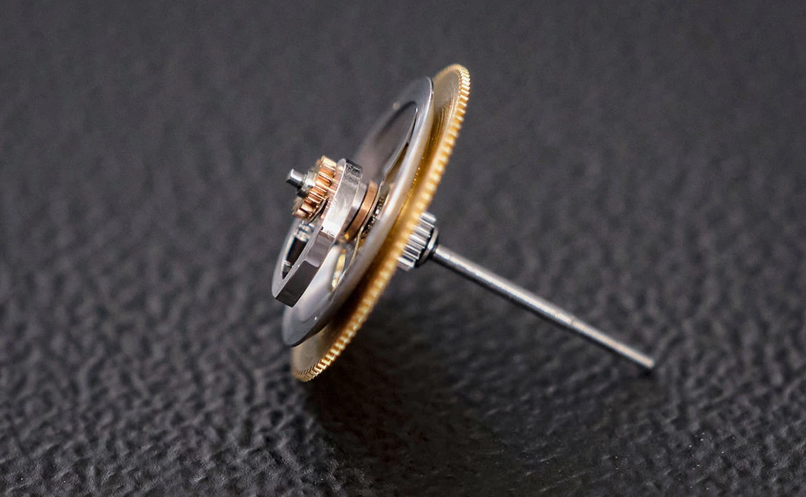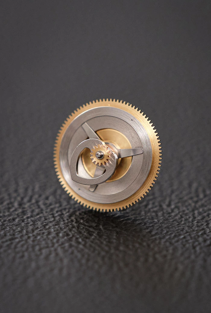 Das Chronozentrumsrad stellt das Herzstück des Chronographenkalibers CH 28-520 C dar, denn auf ihm sitzt die mehrteilige vertikale Kupplung, die steuert, ob der Stoppsekundenzeiger sich dreht. Zudem sitzt auf dieser Welle die Herzscheibe, die im Zusammenspiel mit dem Rückstellhebel den Sekundenstoppzeiger in seine Nullposition bewegt. Der Uhrmacher baut das Chronozentrumsrad aus und demontiert es. Wie bei allen Komponenten kontrolliert er, ob es Beschädigungen gibt, und entfernt grobe Verschmutzungen.