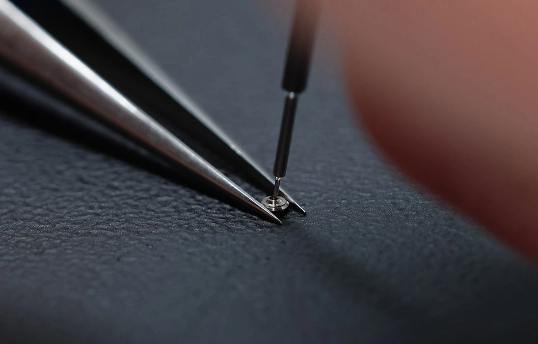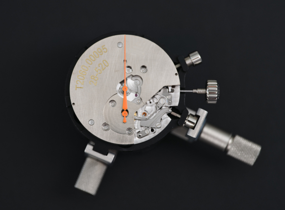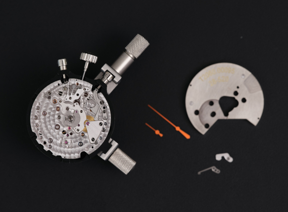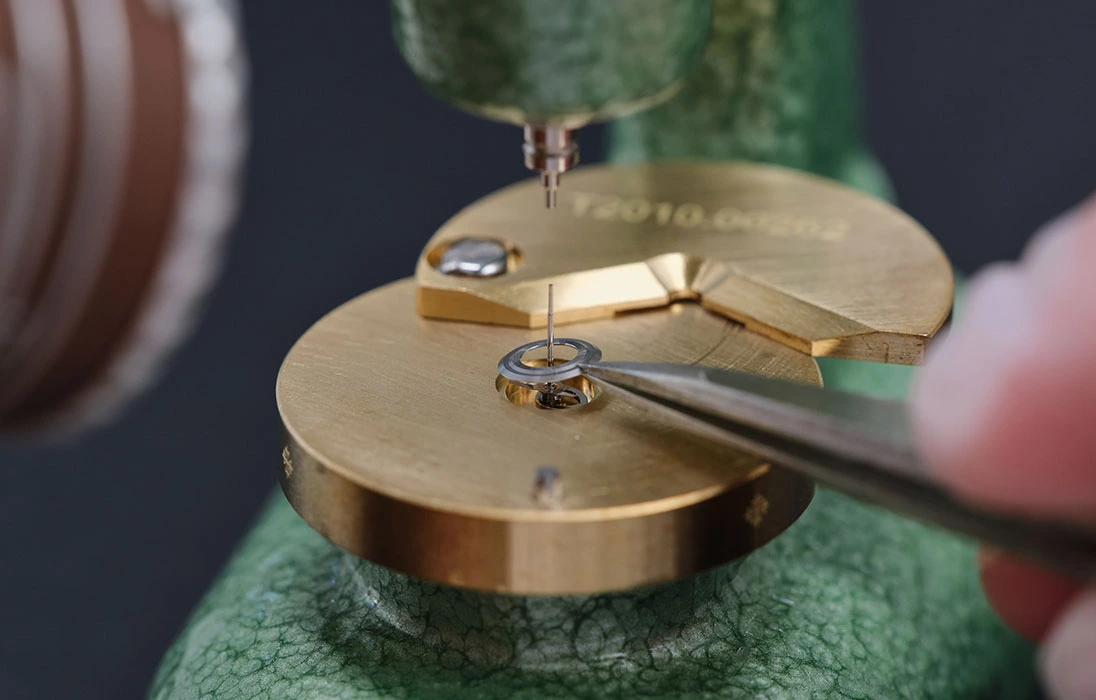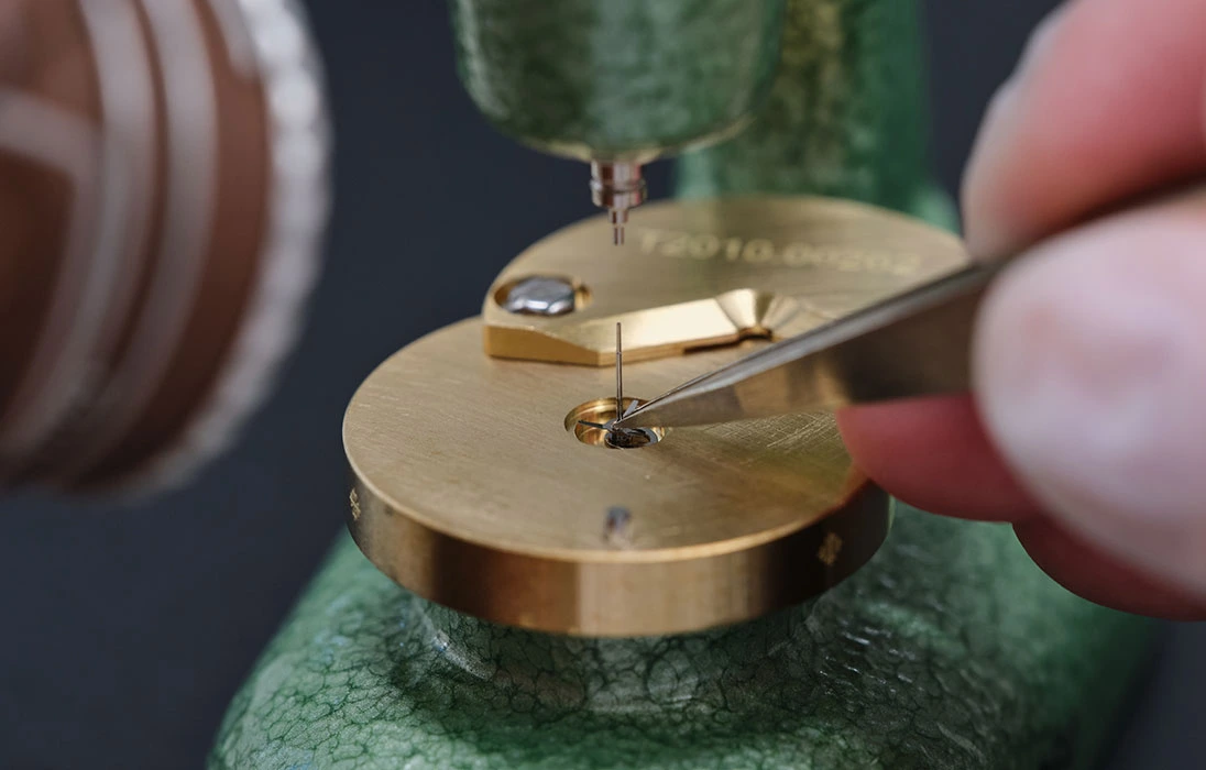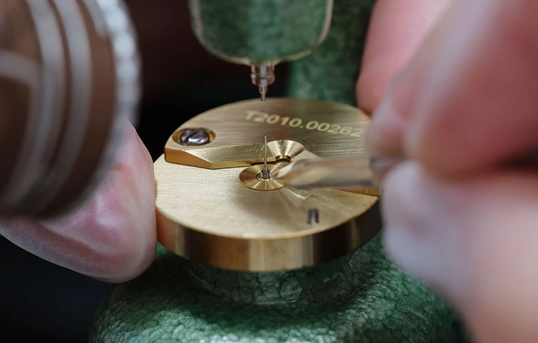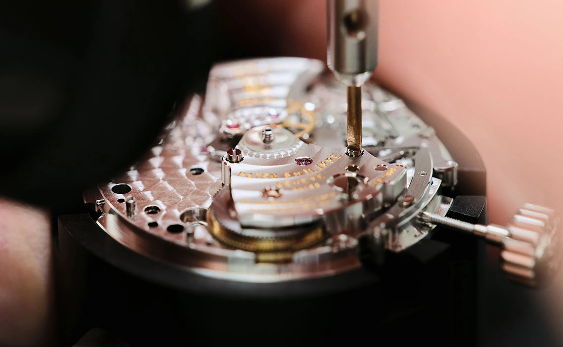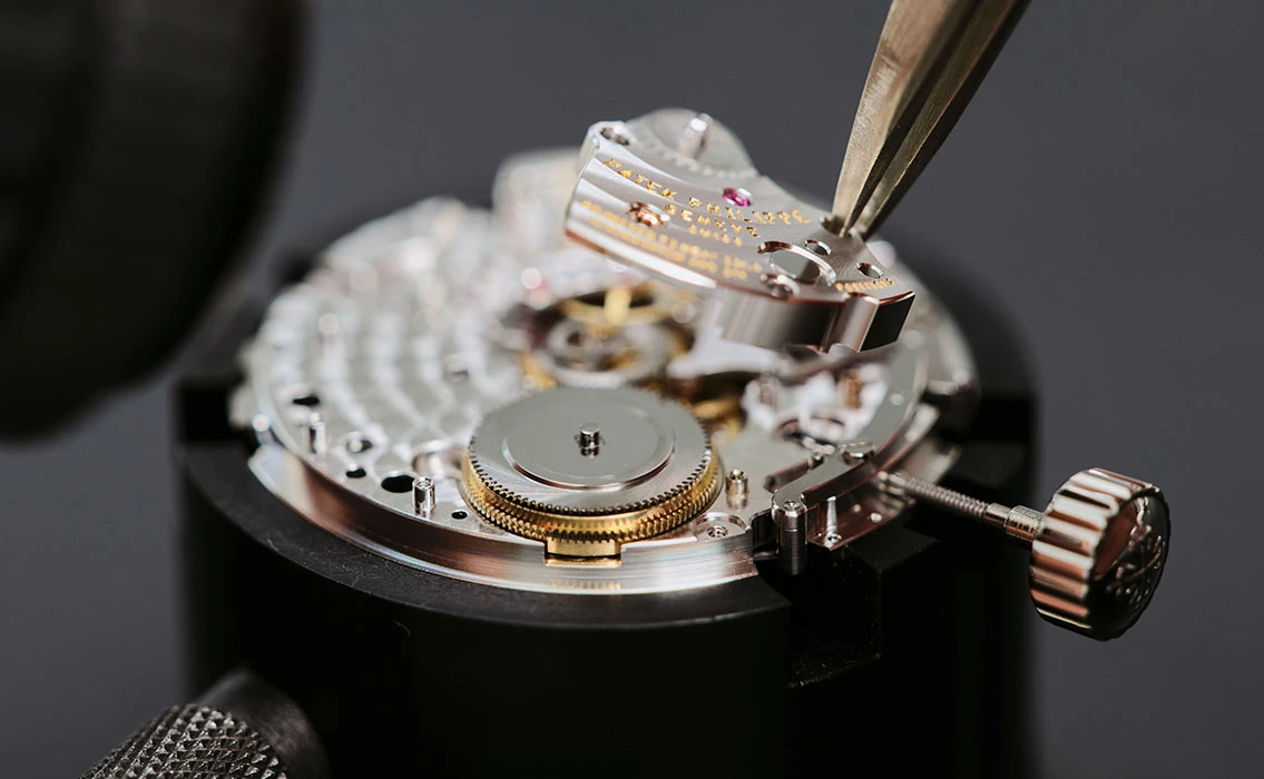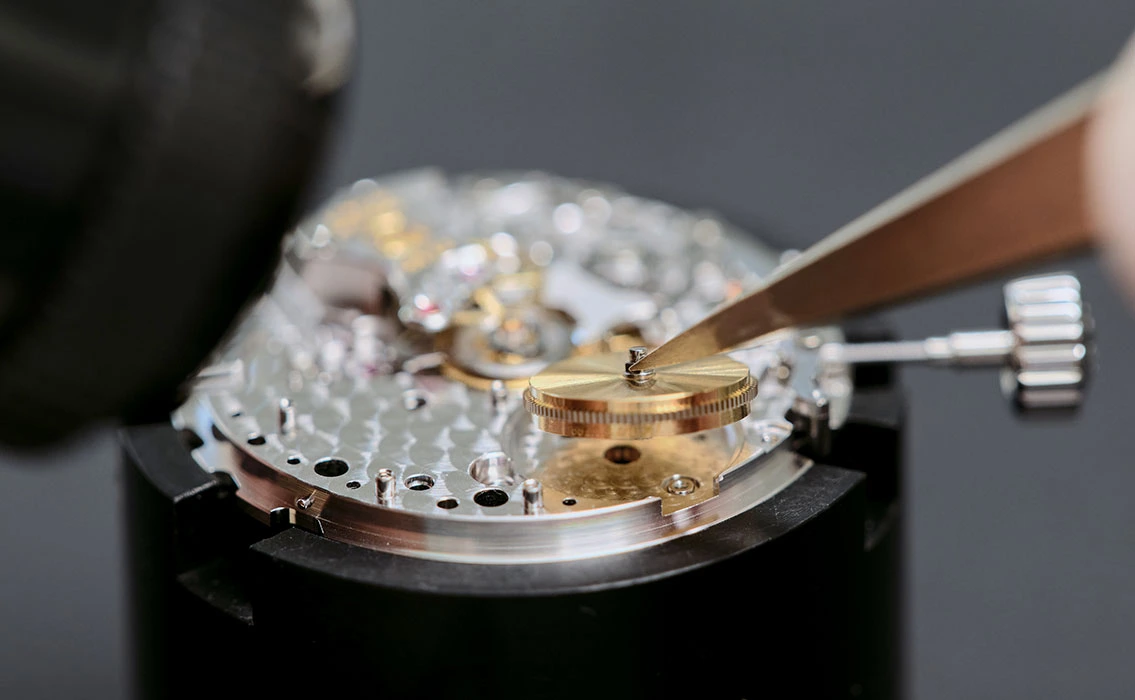 Danach werden das Räderwerk, das Federhaus, die Brücken und die Automatikgruppe eingebaut. Der Uhrmacher montiert die Hemmung und die Unruh mit der winzigen Stoßsicherung. Dabei werden Lagersteine und Rubinpaletten sorgfältig geschmiert. Mit der Zeitwaage wird der Gang, die Gangsymmetrie und die Lagendifferenz geprüft und eingestellt und die Uhr reguliert.