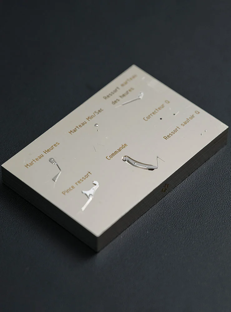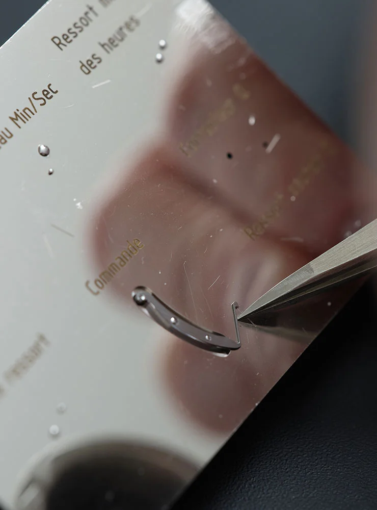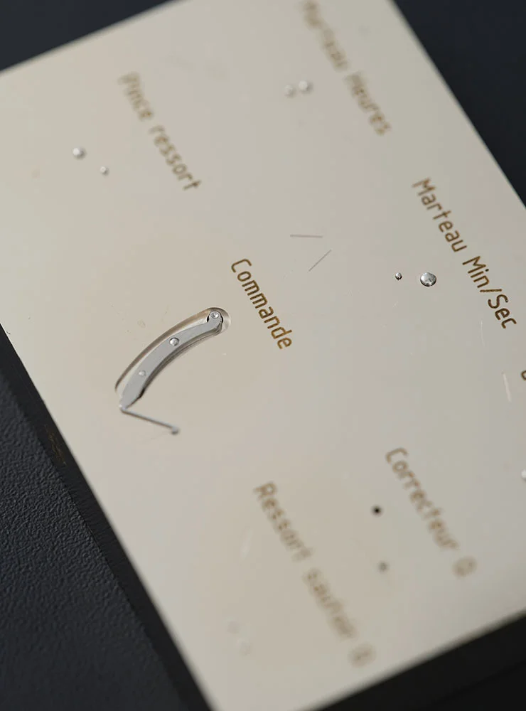 Mit der Federschablone, einem Metallwerkzeug, kontrolliert der Uhrmacher, ob Federn des Chronographen ermüdet oder verbogen sind, und ersetzt oder richtet sie wieder mit der Pinzette. Dann kann der Chronographenmechanismus mit Hebeln und Schaltrad montiert werden, was wegen der vielen Schmierstellen lange dauert. Auch die Höhe der Federn wird eingestellt.