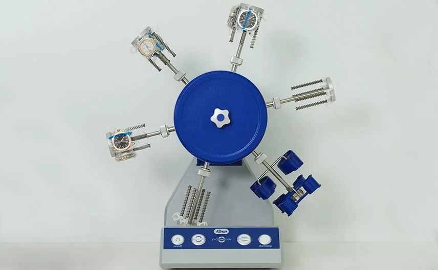 Nachdem das revidierte Werk wieder ins aufgearbeitete Gehäuse eingeschalt wurde, folgt die Qualitätskontrolle, die alleine neun Tage beansprucht. Dabei wird die Aufzugsleistung der Automatik auf dem Umlaufgerät geprüft, getestet, ob die geforderte Gangreserve erreicht wird, und die Ganggenauigkeit in unterschiedlichen Lagen sowie nach 0 und 24 Stunden kontrolliert. Um die strengen Vorgaben des Patek Philippe Siegels zu erfüllen, muss die Ganggenauigkeit im Bereich von -1 bis +2 Sekunden am Tag liegen.