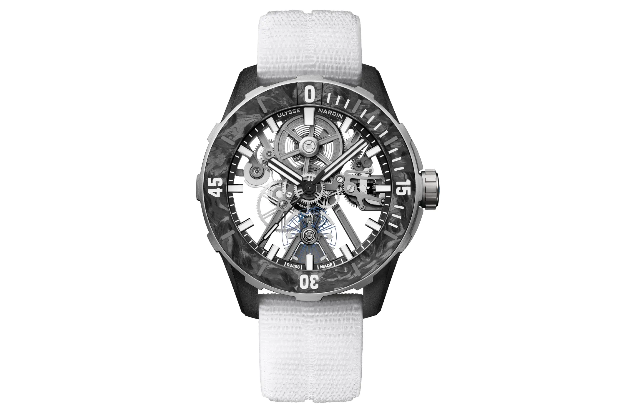 The Diver [AIR] boasts a minimalist skeleton dial that offers a window into the watch’s intricate movement. With black indexes and hands coated in white Super-LumiNova, the dial ensures readability in low-light conditions, an essential feature for dive watches. The open architecture of the dial is not just for show; it plays a crucial role in reducing the overall weight of the watch. By exposing the movement, Ulysse Nardin has managed to cut down on unnecessary material, staying true to the watch’s ethos of minimalism and functionality. The aesthetic of the skeleton dial is further enhanced by the use of high-tech materials, including the oversized balance wheel and silicon balance spring, which are visible through the open design.