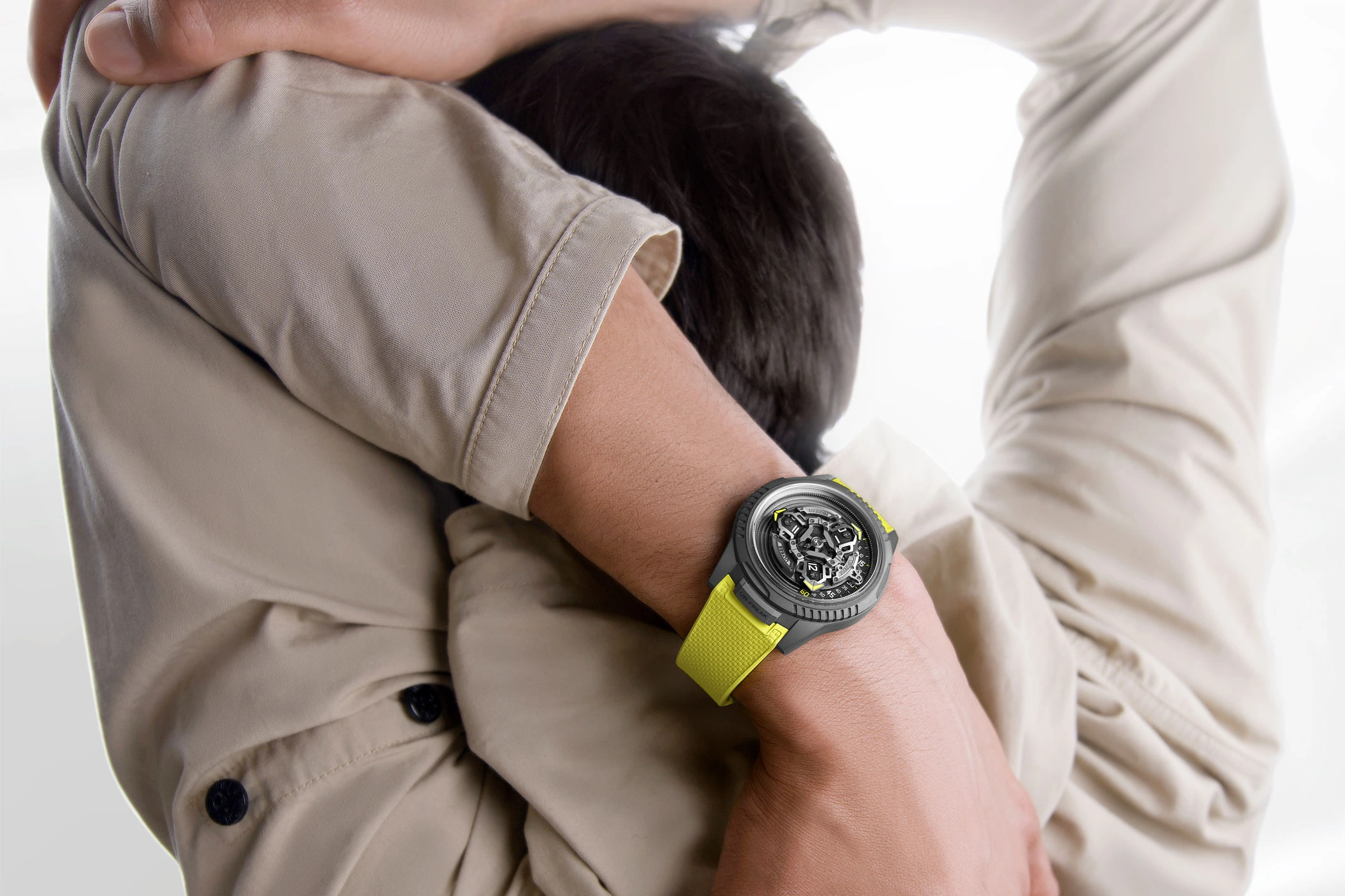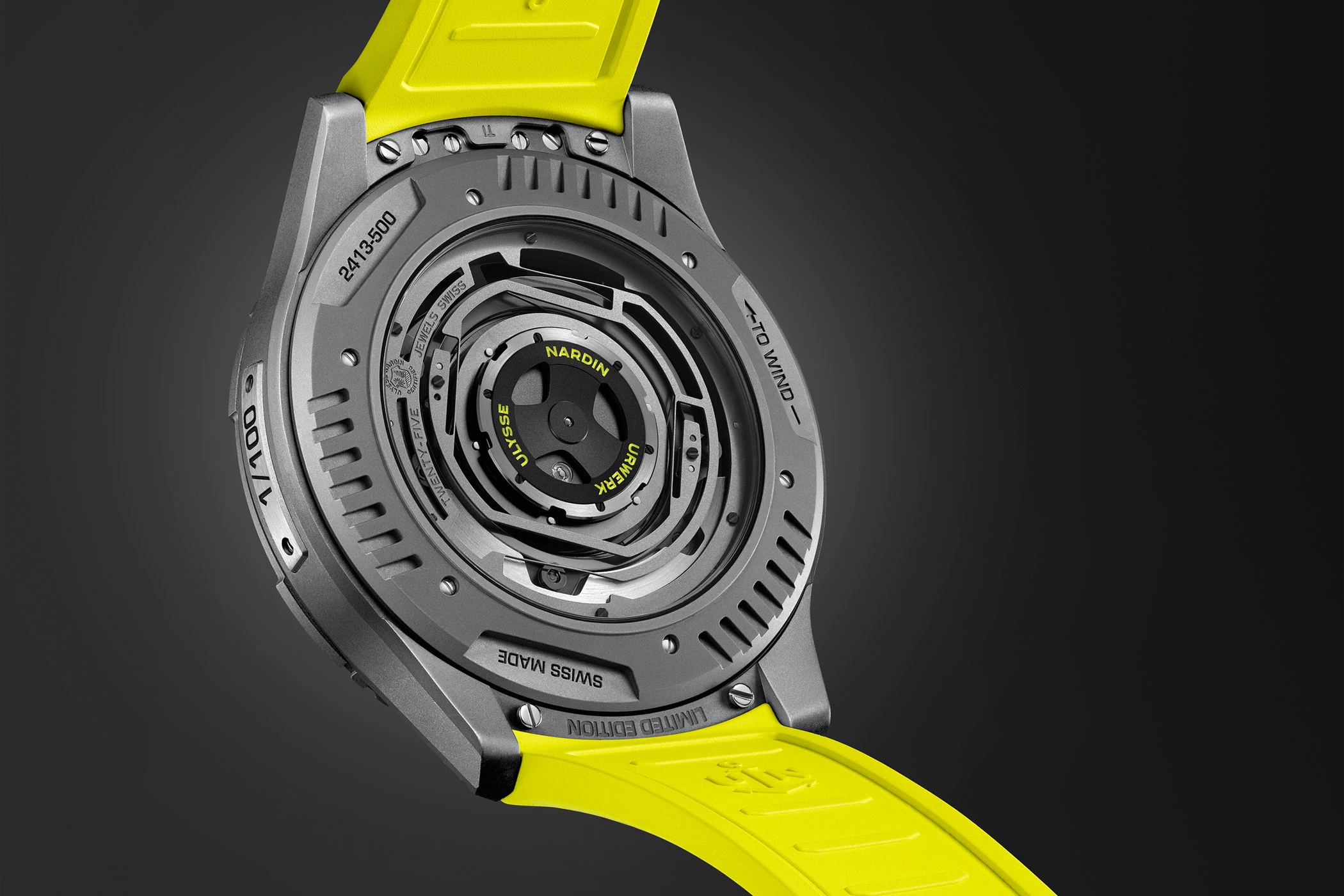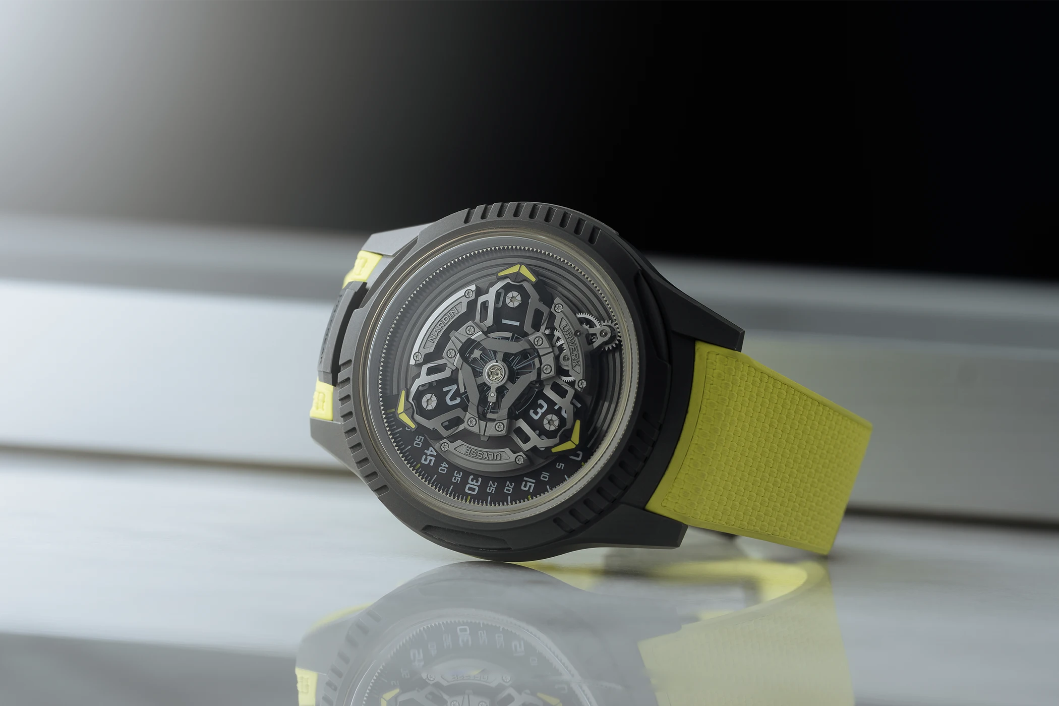 The elaborately decorated UN-241 is protected by a 44-millimetre titanium case with a sandblasted finish and distinctive notches. Neon yellow accents with Super-LumiNova coating, along with a colour-coordinated strap, provide striking highlights.