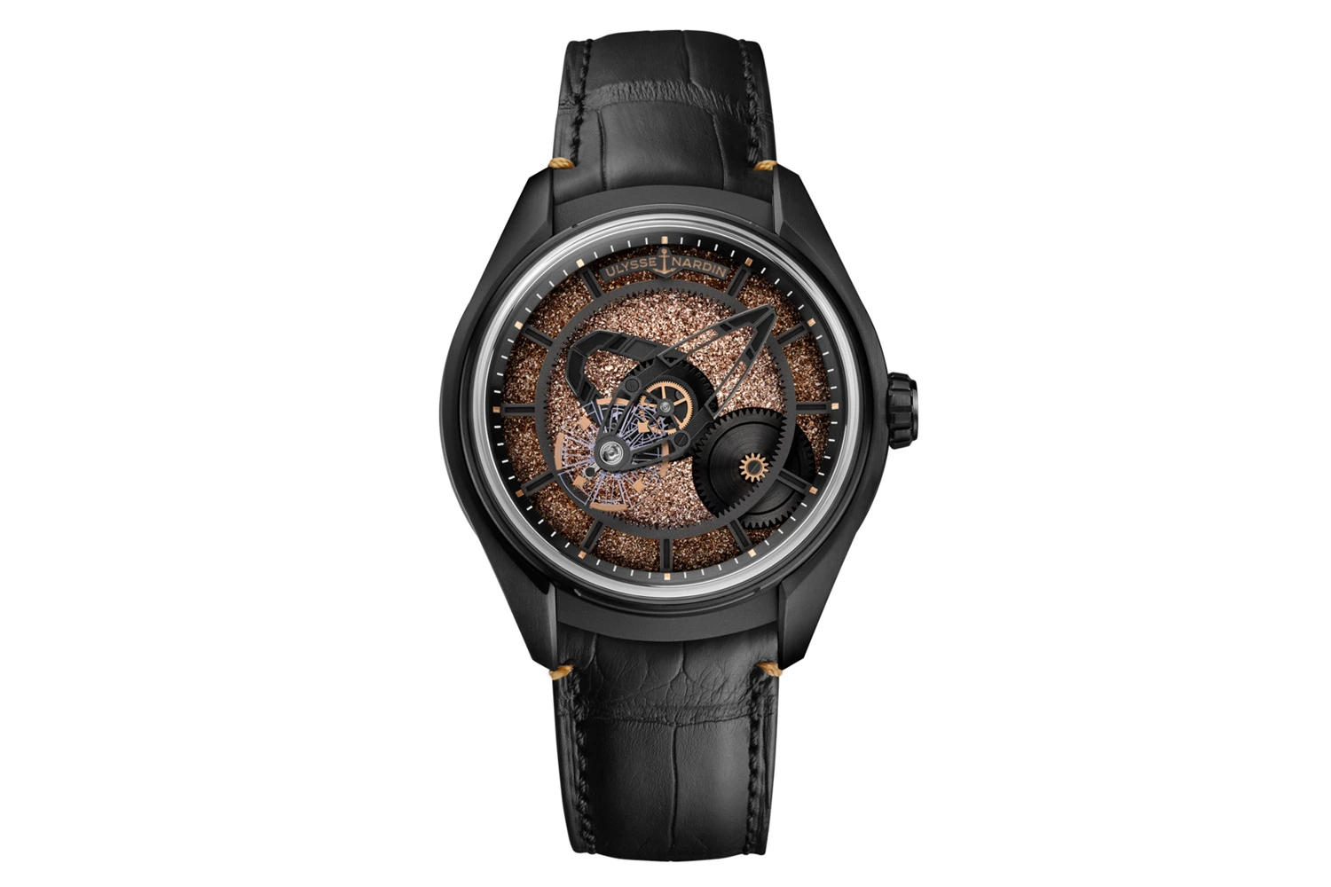 These are diamond-coated silicon components, designed to ensure the escapement can withstand up to 185 million impacts per year, guaranteeing both precision and longevity. Added to this is Ulysse Nardin’s patented Grinder system – an exceptionally efficient, low-friction automatic winding mechanism that is activated even by the tiniest movements of the wearer, converting them into kinetic energy.