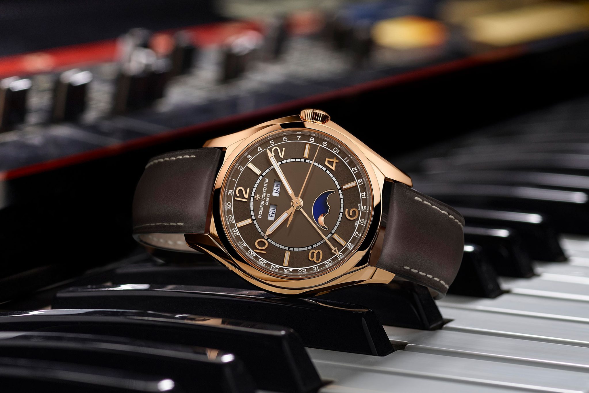 Framed by a 40 mm-diameter 18 carats 5N pink gold case, the sepia brown-toned dial is visually extended by a calfskin leather strap. Punctuated by day, date, month indications – as well as a moon phase requiring no adjustment for 122 years.