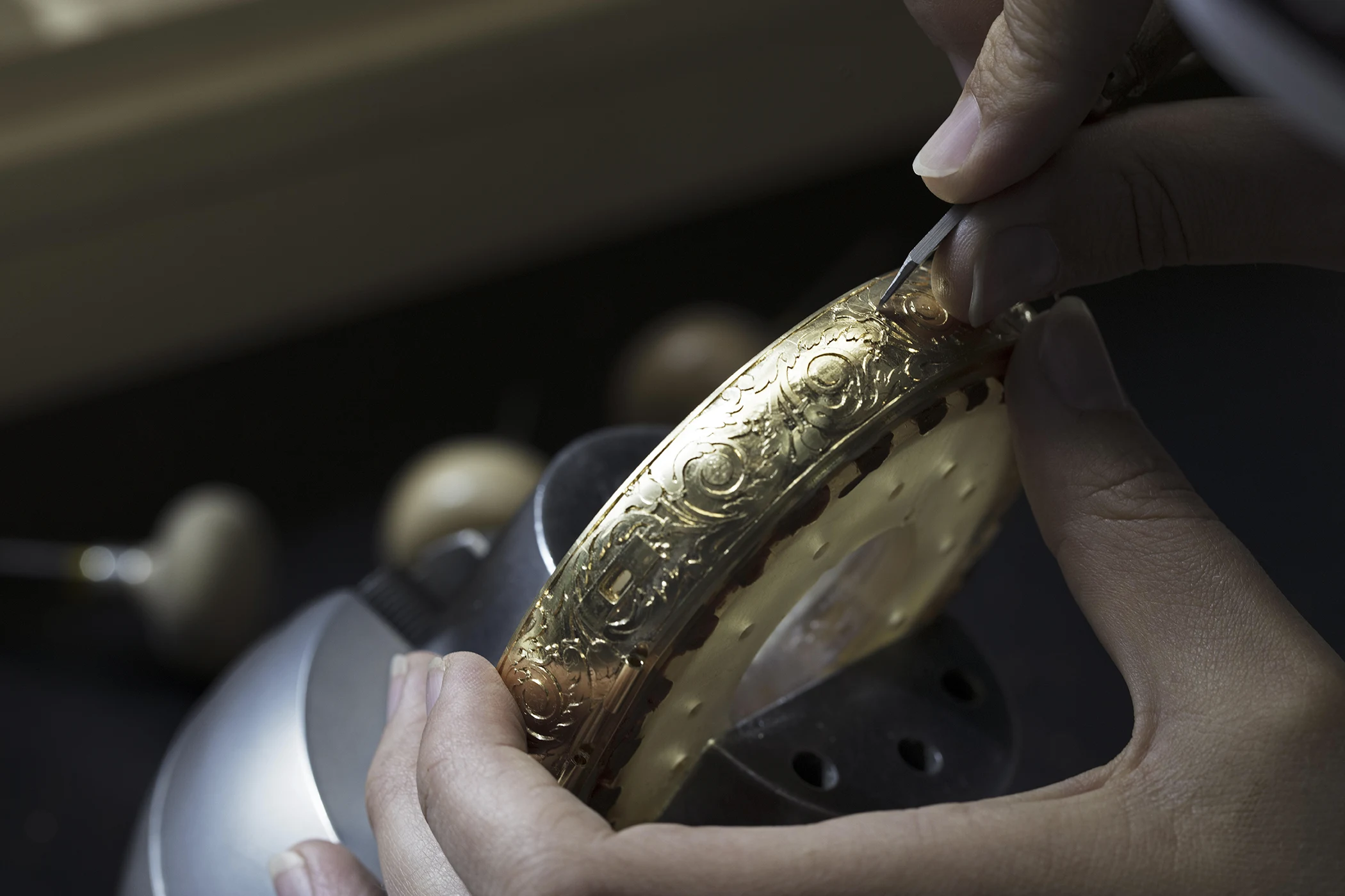 “What is super interesting with engraving is that there are quite a lot of different techniques that you can use,” says Selmoni. The workshop’s strength, he suggests, is that it is not stylistically monolithic. “We have engravers who come from different areas, for example one who was engraving rifles; a very specialist type of engraving, sometimes mixing two different types of gold. Engraving is fascinating because you are using your hands to remove or sculpt metal: you have to put a lot of force into it, yet be controlled and very, very precise.”