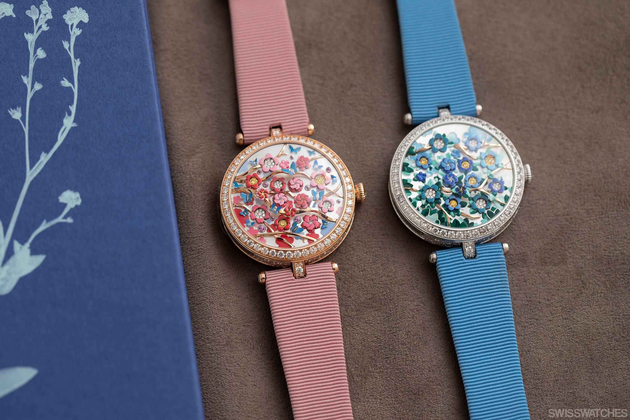 In order for the Lady Arpels Heures Florales to perform, 166 components are set into motion. Yet the dial alone actually has a total of 226 elements on it, arguably making it the most complex part of the entire watch. The mechanical movement inside the watch is fitted with a special module, which opens the 12 flowers to display the hours. Every single petal of each of the 12 flowers connects to the module. Each of the flowers has an opening process with three different sequences. For every hour that passes, the open flowers close to make way for a new combination. Over each 1.5 days, the sequence of the bouquets that succeed one another from hour to hour will be different. In other words, the wearer doesn’t know which flower is going to pop up next; it remains a surprise. Only at midnight and midday do all flowers simultaneously bloom.