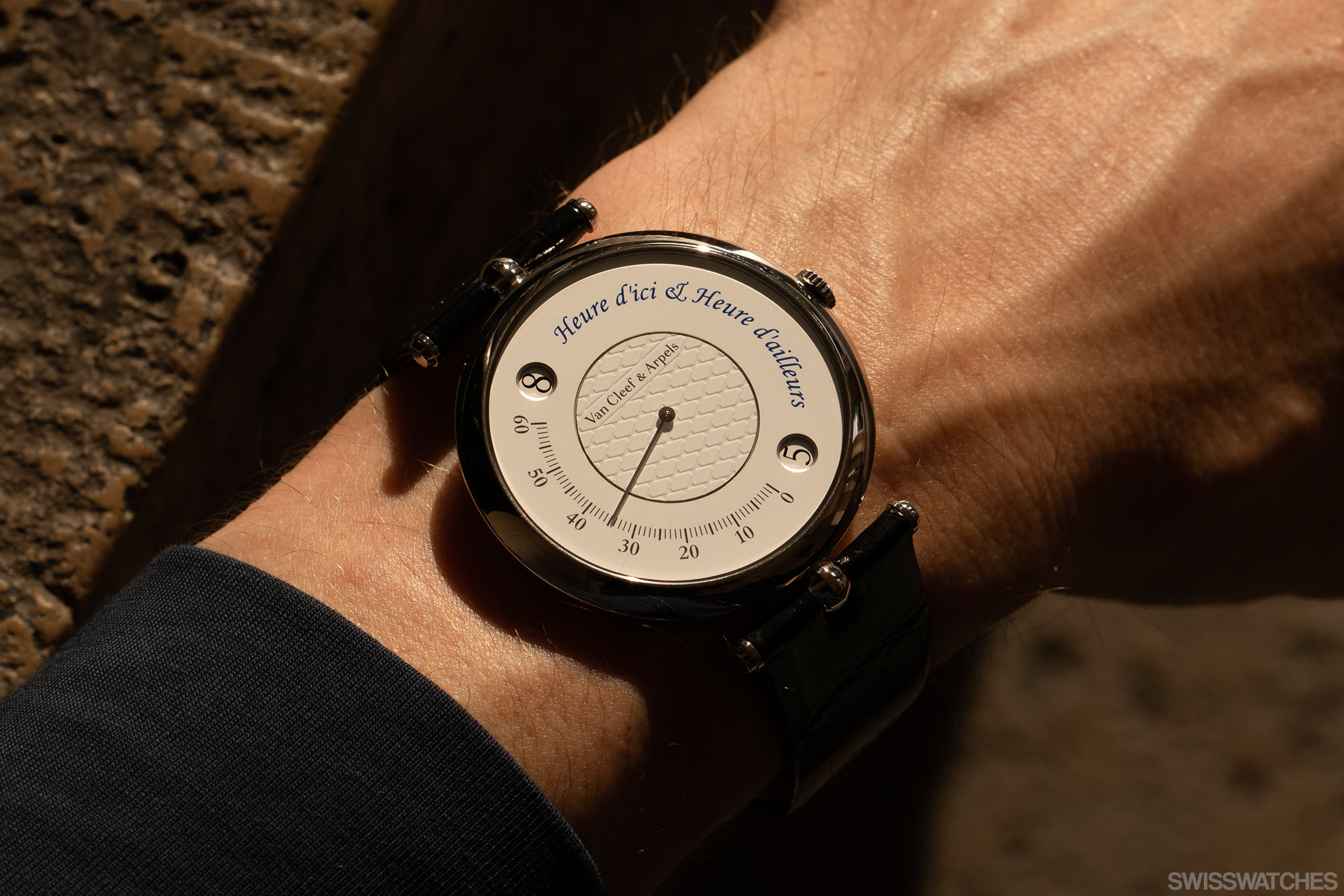 One final piece worth a mention is the Van Cleef & Arpels Pierre Arpels Heure d’Ici & Heure d’Ailleurs, which takes the old-world charm of the jump hour and turns it into something quietly poetic for the modern traveller. Born from a mechanism first patented in 1883 by Josef Pallweber and once adored in the Art Deco era, the jump hour display skips the traditional hands and instead reveals the hour through apertures that ‘jump’ at the turn of the minute. Van Cleef & Arpels pushes the concept further: this 42 mm white-gold piece doesn’t display just one time zone, but two, as its name suggests: Time here and time elsewhere.
