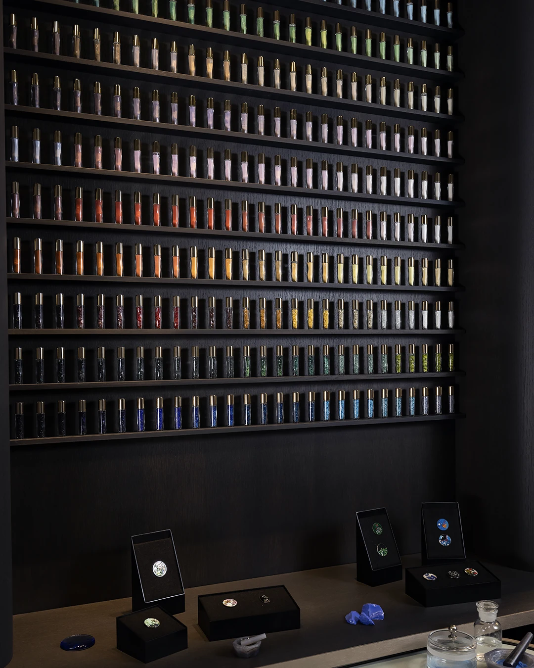 An entire shelf in the enamel cellar is devoted to blues, with shades ranging from midnight to near-white. Yet the powders are misleading: a blue enamel may emerge ruby red once fired, the metallic oxides awakening in the kiln. The transformation is alchemical and unpredictable to those not well-versed in the craft. “Ultimately, the fire decides what comes out – not us,” Rainer smiles.