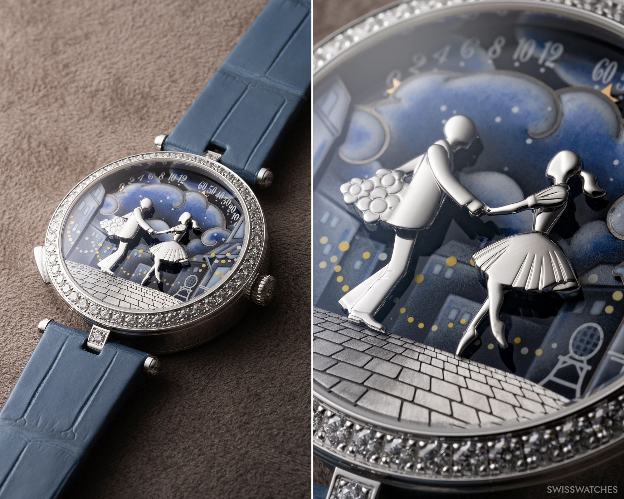 It would be a crime not to mention one of Van Cleef & Arpels’ most beloved creations, the Pont des Amoureux series. Introduced in 2010, reimagined in 2019, and returning in 2025, it depicts two lovers meeting on a miniature Parisian bridge at midday and midnight. A female figure indicates the hours; the male makes his way along the retrograde minutes, ascending and descending the arc until they meet for a kiss.
