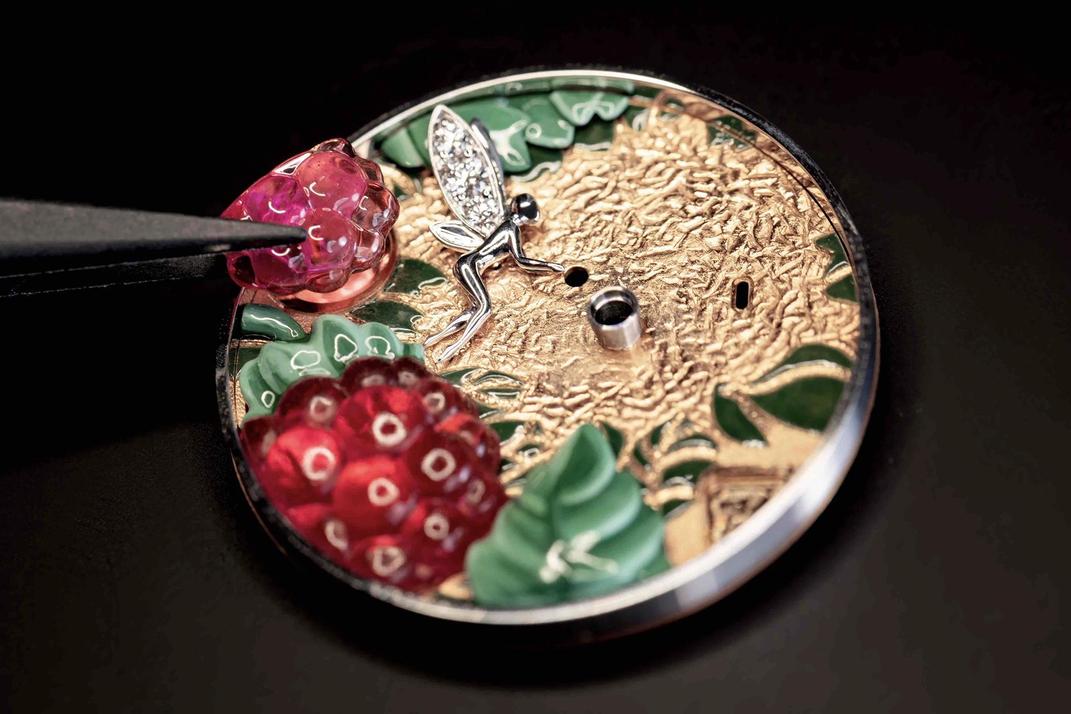 Over the years, certain motifs have become signatures of the Van Cleef & Arpels world: ballerinas, fairies, flora and fauna, depictions astrology – and, of course, love. According to Bernard, these variously interwoven motifs leave much space for imagination and creativity. “Anyone at the Maison can come forward with an idea,” says Bernard. A keen gardener might suggest grasses that appear to be swaying in the wind; a bird-watcher might observe how a mother bird brings food to her babies in the nest. Anything can be replicated; nothing is impossible. Indeed, in order to create a watch that actually appeared to be swaying in the wind, Van Cleef & Arpels conceived a special mechanism in the movement to create a life-like effect. Such endeavours are common practice for the Maison, yet hard to imagine at many other manufactures.