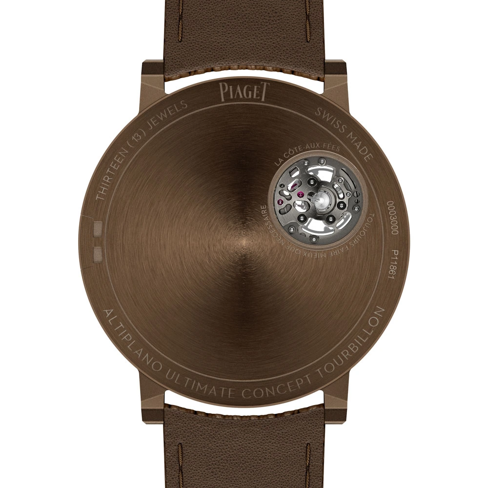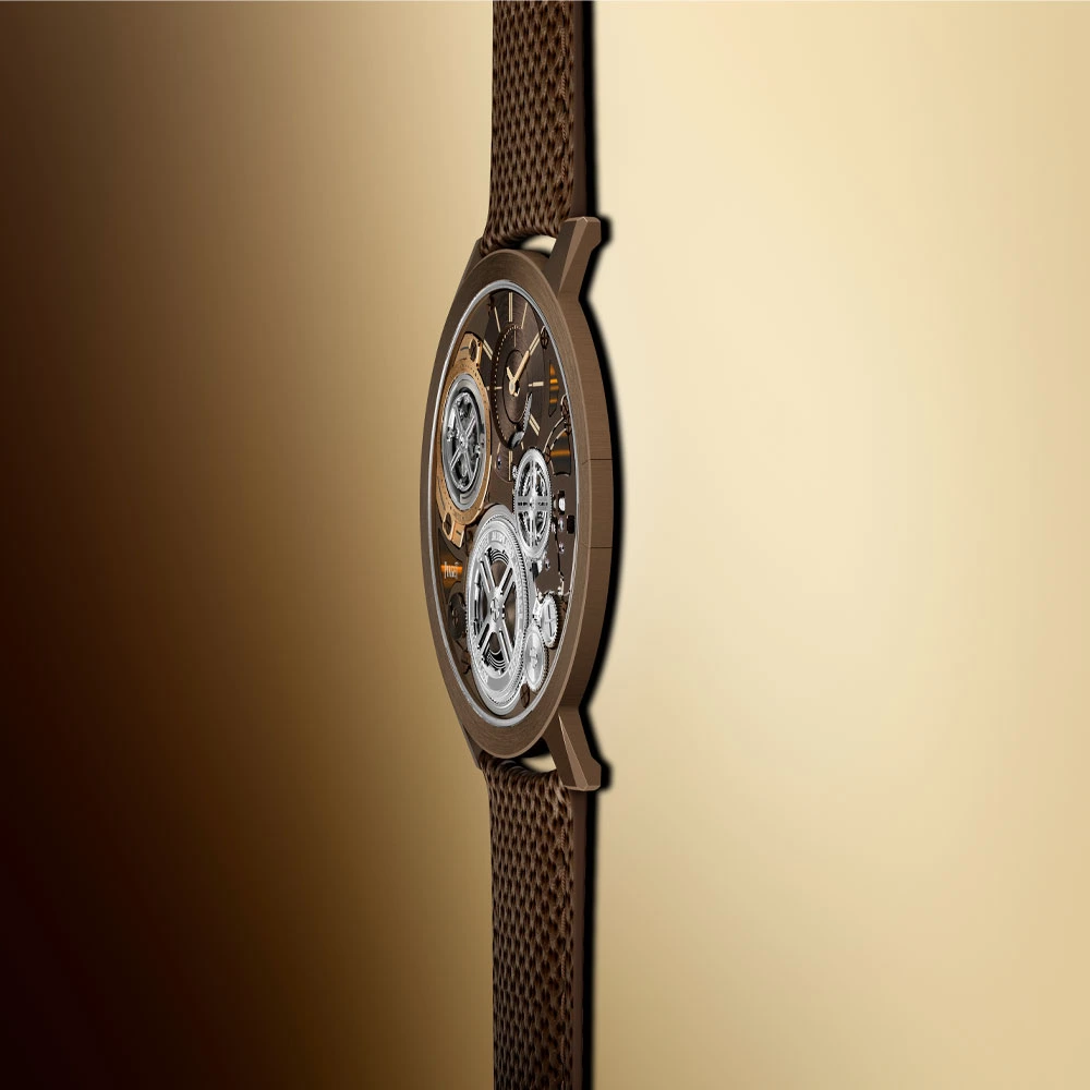 The ultra-thin hand-wound calibre 970P-UC beats at a frequency of 4 hertz (28,800 vph) and offers a power reserve of at least 35 hours. It is worn on a brown calfskin strap with a mesh structure and a Kevlar core. The price in Germany is 750,000 euros.