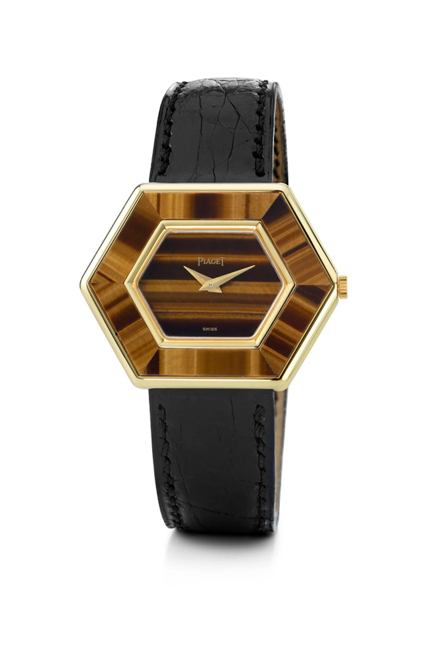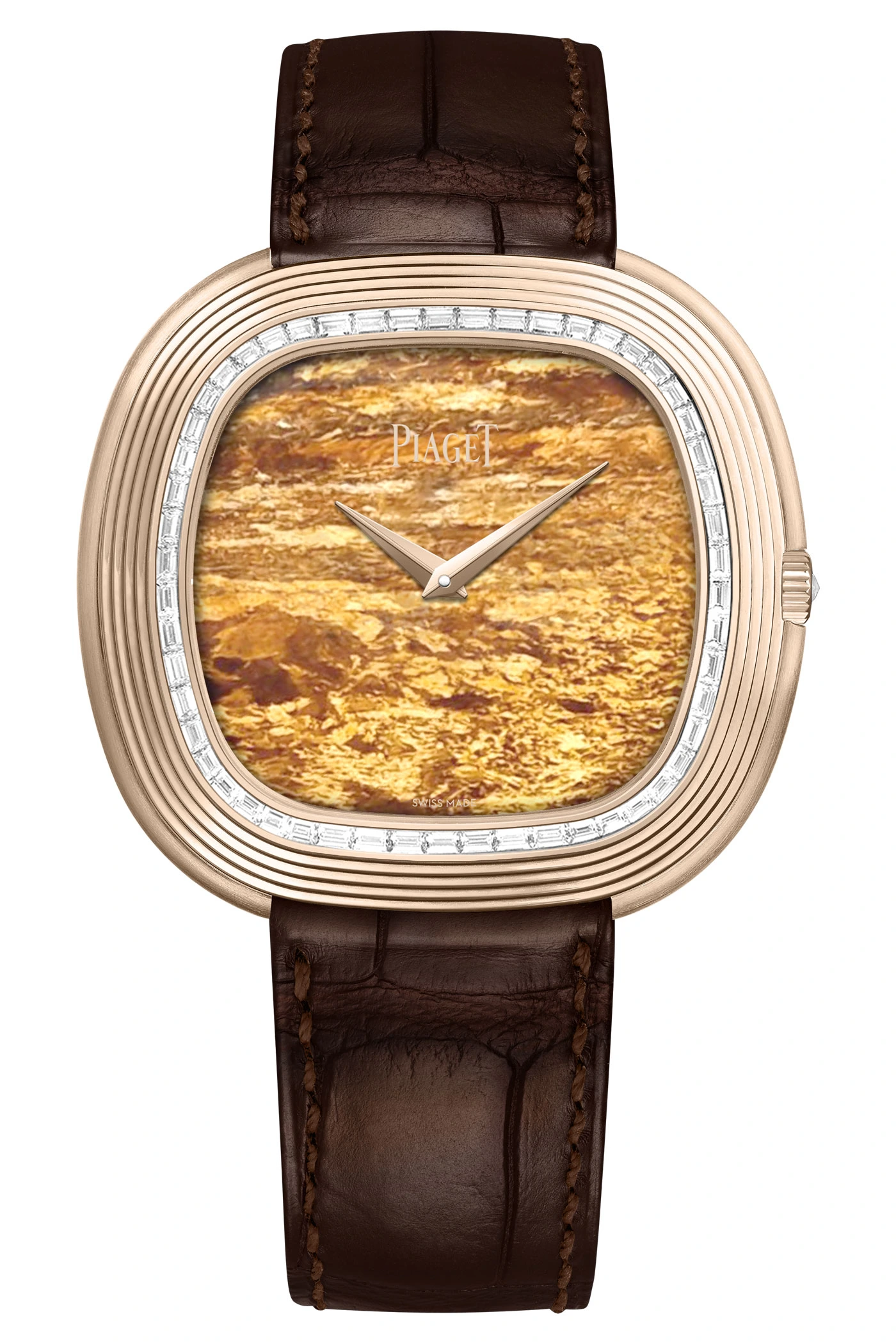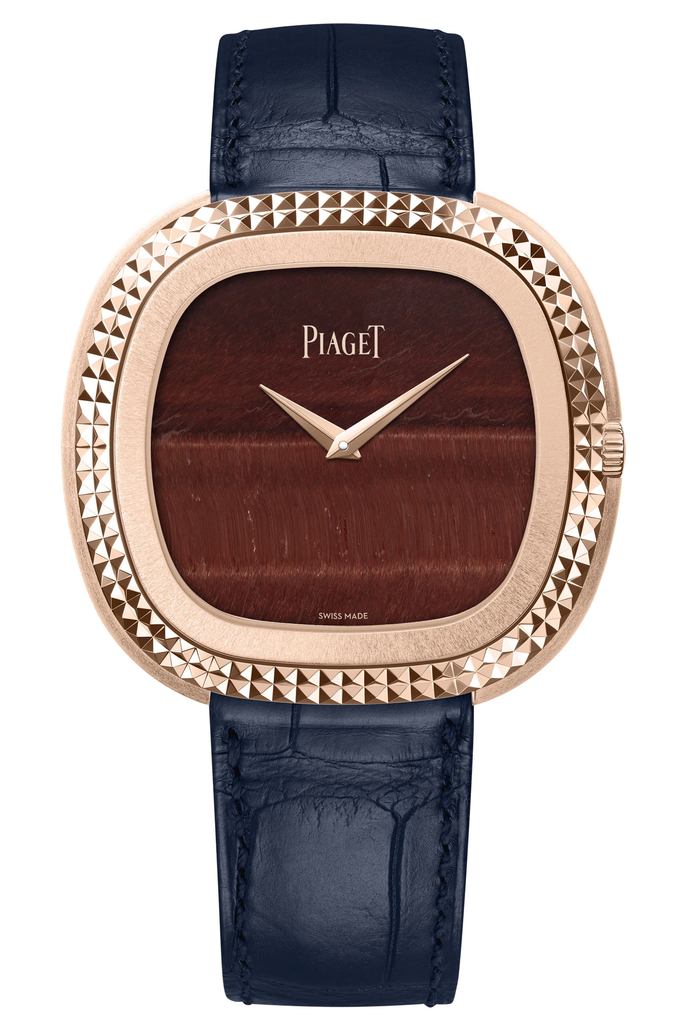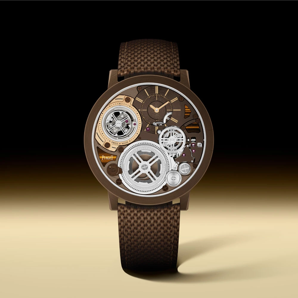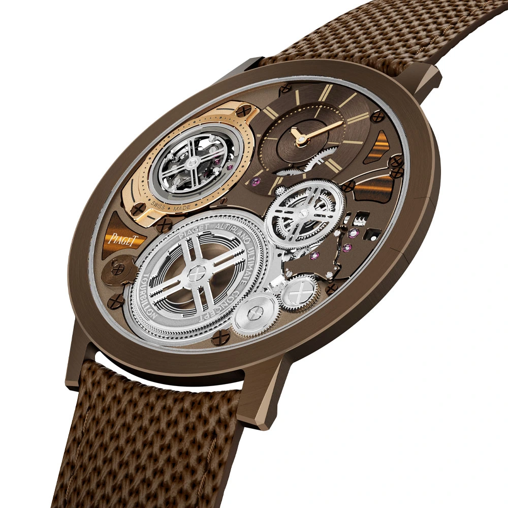Consequently, the various components are arranged side by side rather than one on top of the other. Elements made of tiger’s eye have been perfectly integrated into this structure. To remove any assembly residue, Piaget uses a needle just 0.15 millimetres thick to prevent damage to the stones. To achieve this, Piaget combines a brown cobalt alloy in a matching shade with rose gold.