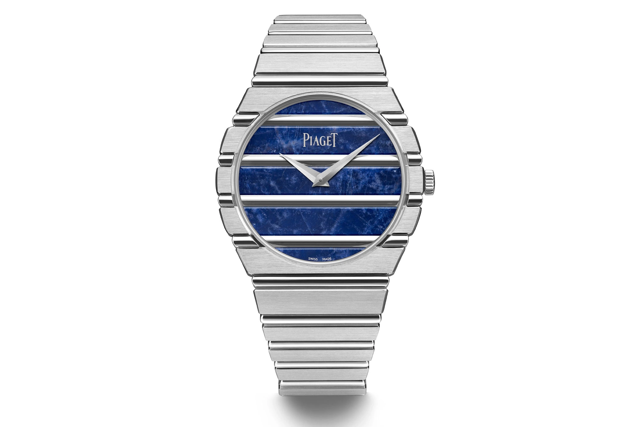 In 2026, the watch also boasts an elegant dial, featuring the blue gemstone sodalite from the silicate mineral group. Characteristic of this stone are the white or grey veins of calcite, which make each stone unique – and thus every dial of the Piaget Polo 79 as well.