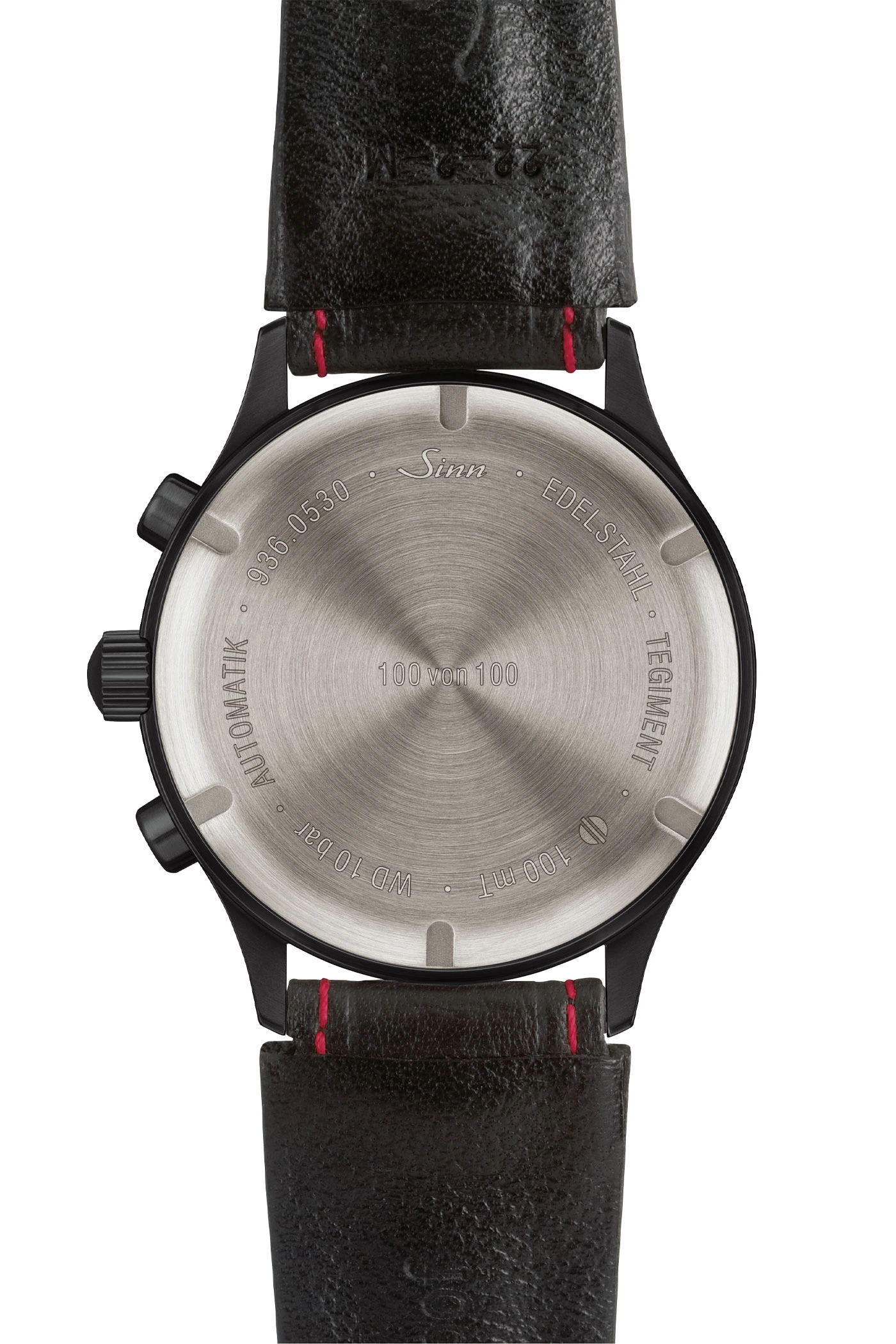 Unlike its predecessor, the 43-millimetre-wide and 15-millimetre-high stainless steel model 936 S features a black hard-coating. To prevent the so-called ‘eggshell effect’ – the flaking of hard coatings on soft base materials – SINN uses this technology exclusively on Tegiment surfaces.
