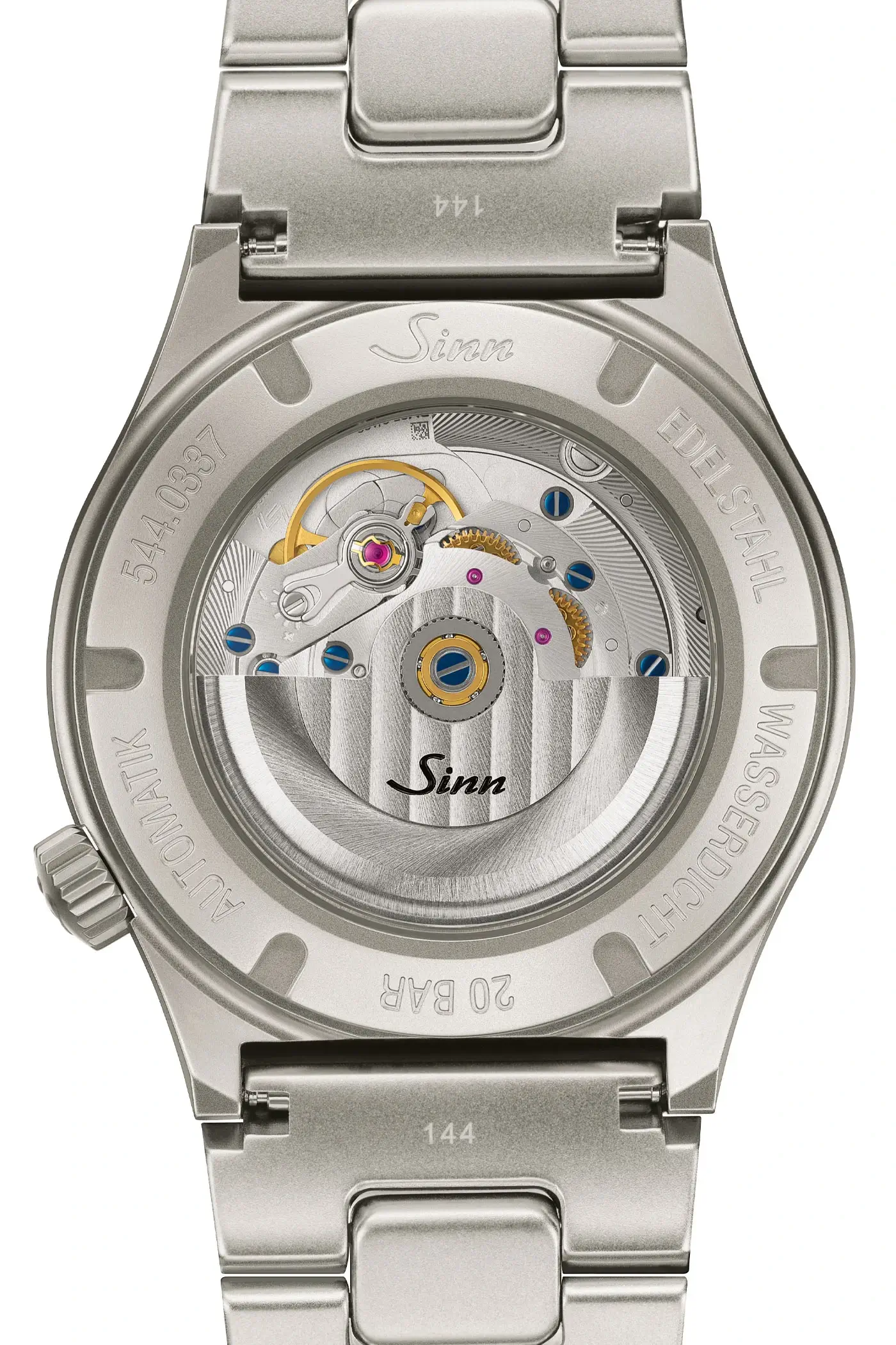 Water resistance up to 20 bar is ensured by a screw-down case back and the D3 system (“direct double sealing”) developed by Sinn. This system eliminates the need for additional sleeves and instead relies on high-precision guidance of the push-piece pins and crown shafts directly within the case bore.