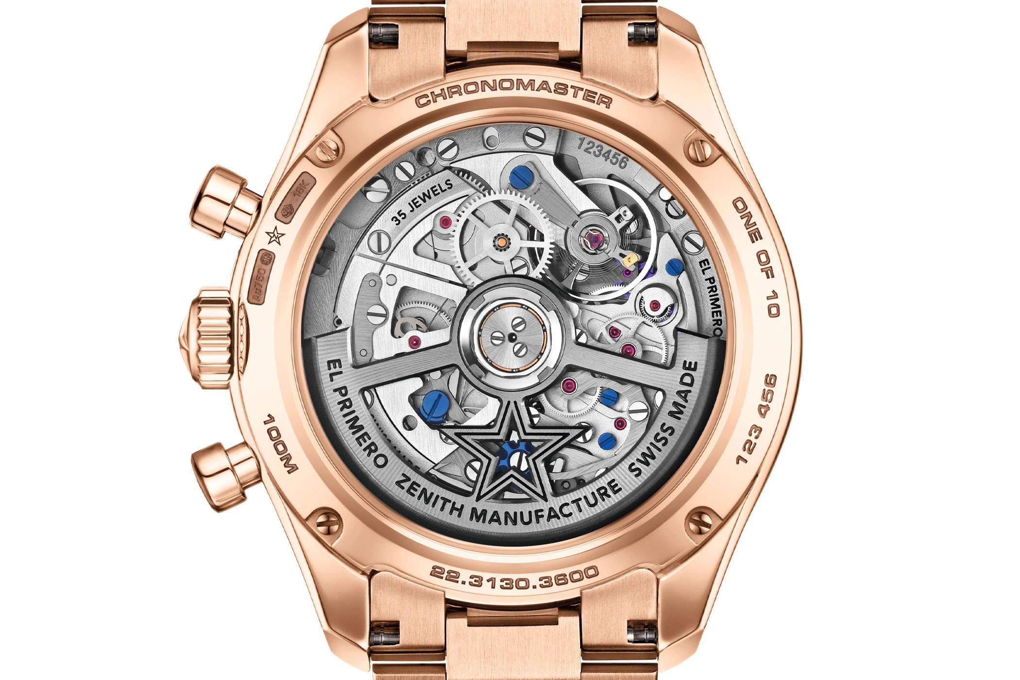 The El Primero 3600SK can be admired not only through the tinted dial but also through the sapphire-crystal caseback. Visible are the blue-lacquered column wheel and the horizontal clutch architecture of the automatic movement.