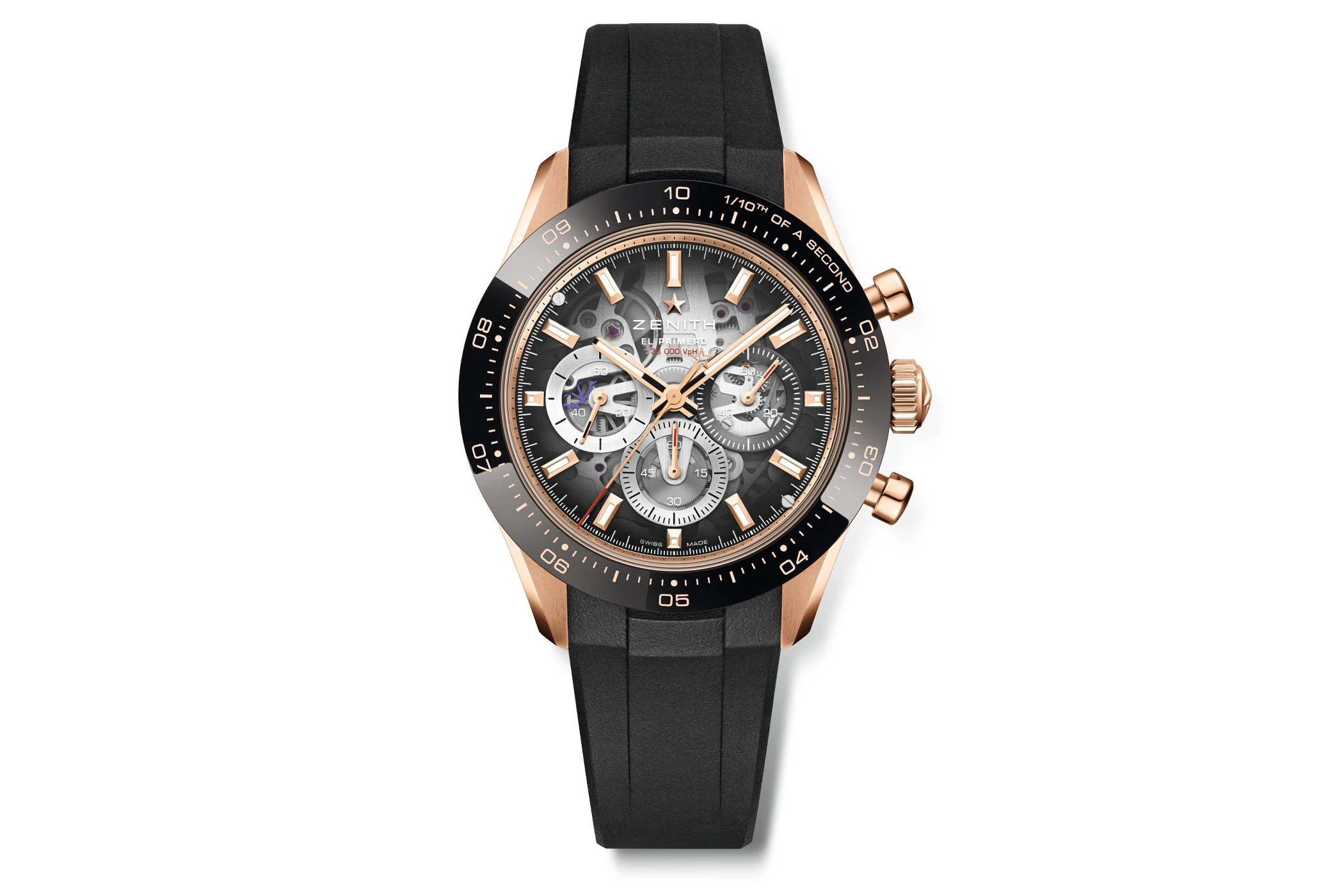 The new Chronomaster Sport Skeleton models are powered by a skeletonised version of the high-beat El Primero 3600SK movement. With a frequency of five hertz (36,000 vph), it enables the precise measurement and display of tenths of a second. This means that the central chronograph hand completes one full revolution in ten seconds, as opposed to once per minute in conventional chronographs.