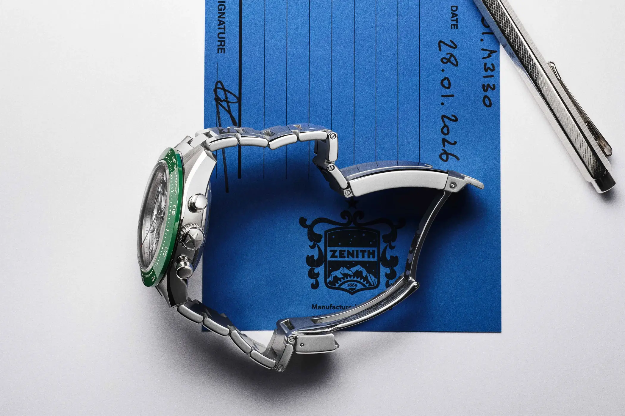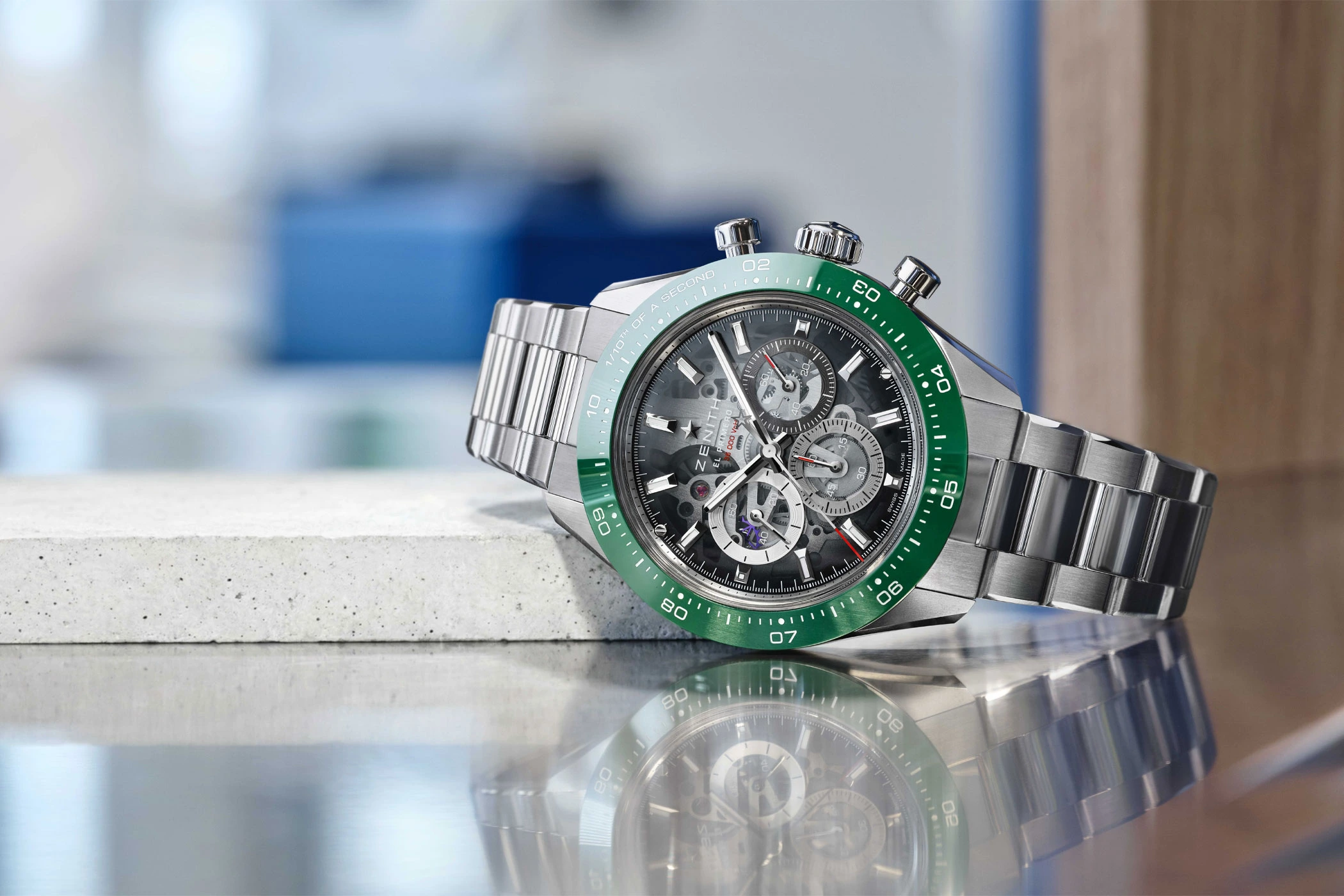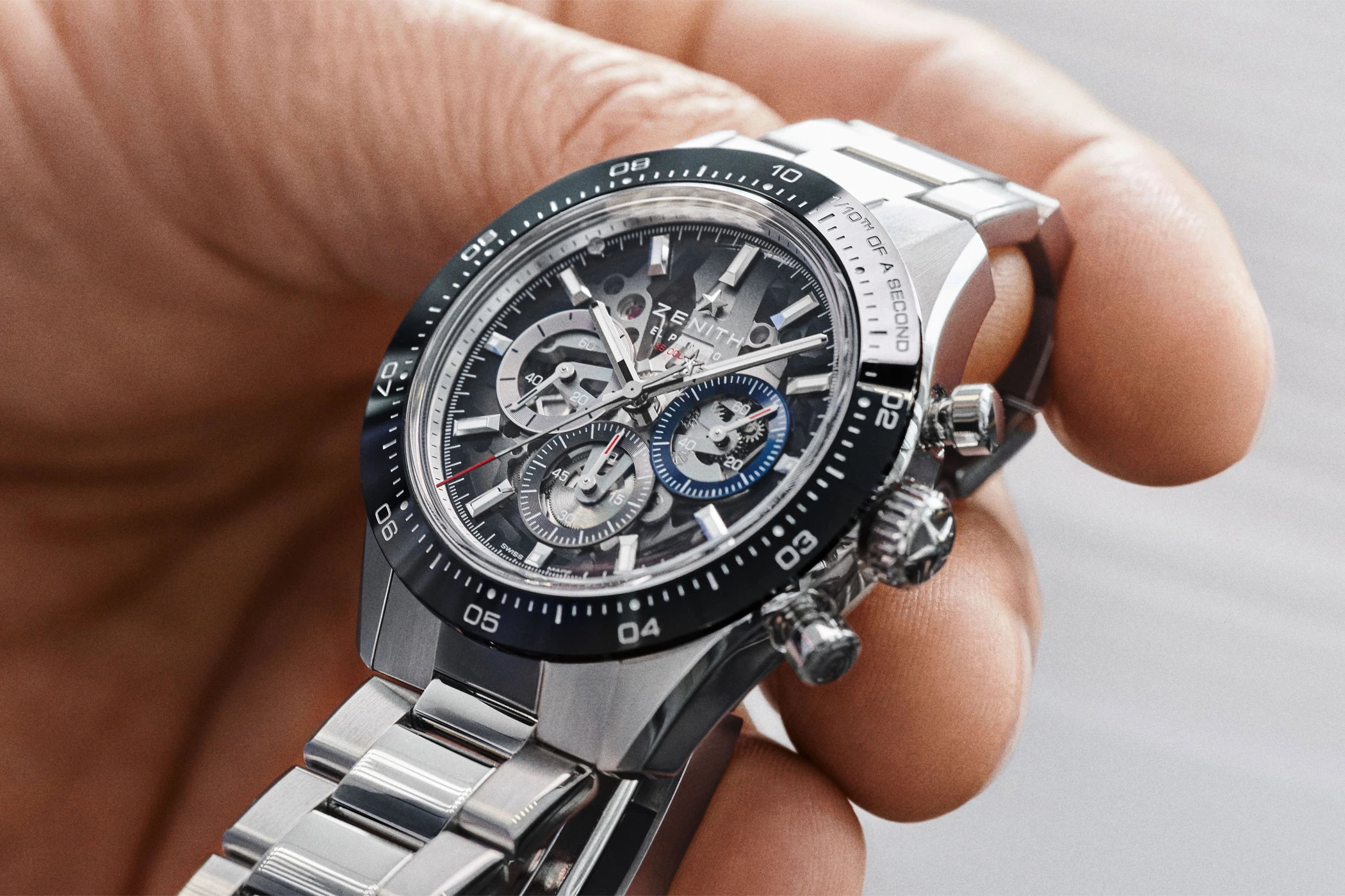 Zenith invested three years in developing this new construction, consisting of 41 components. The new patented folding clasp was developed through research, fine-tuning, optimisation, and numerous wear simulations, and will gradually be introduced across further references in the future. For the time being, it secures the new Chronomaster Sport Skeleton stainless-steel models. Combined with a metal or an additional, color-coordinated rubber strap.