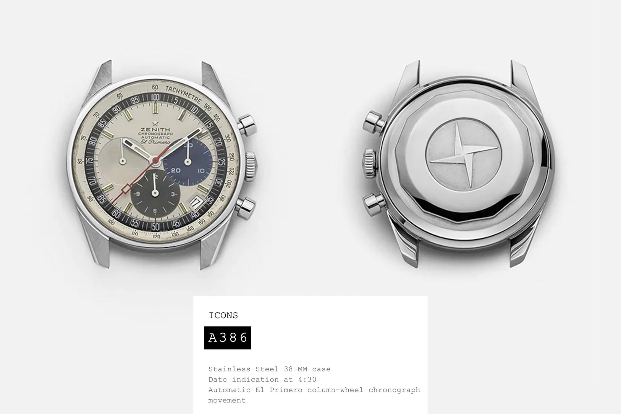 The world’s first integrated, high-frequency, automatic chronograph calibre was introduced in 1969. One of the earliest models to feature this calibre was the stainless-steel Zenith A386. The 4,500 watches produced of this model until 1972 featured a distinctive tricolour dial design, setting them apart from the monochrome chronograph layouts that were common at the time. Today, alongside the essential El Primero movement, this remains a defining feature of many models in the Chronomaster collection.