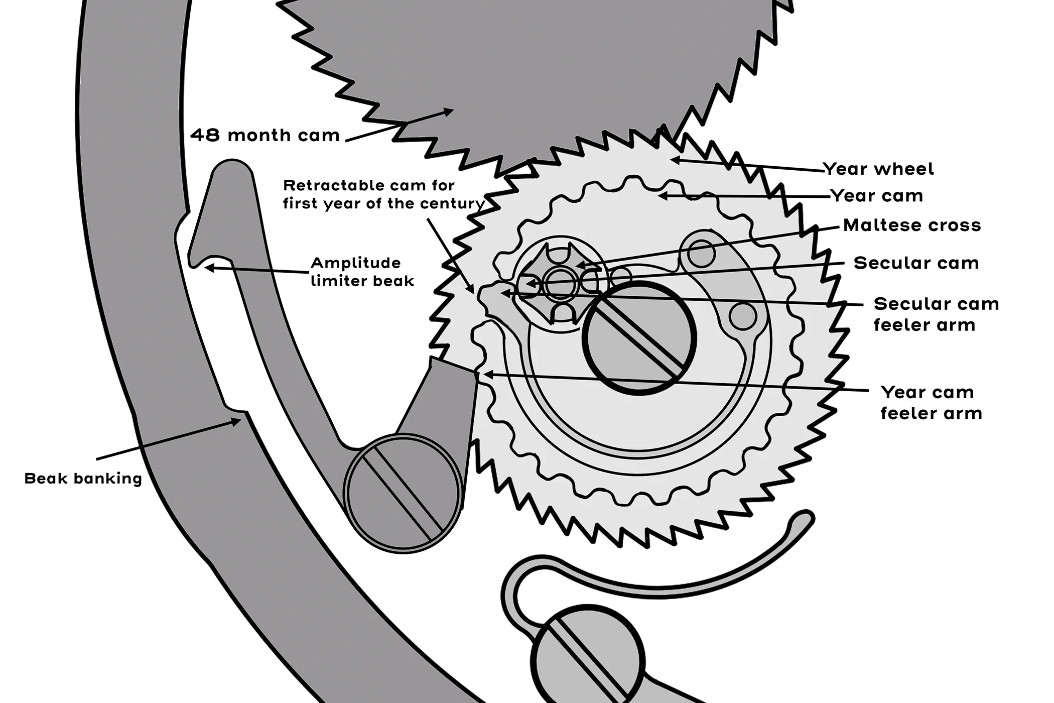 A lever ‘reads’ this information and transmits it to the date wheel, allowing it to skip days at the end of the month if necessary (for example, jumping directly from 30 April to 1 May).