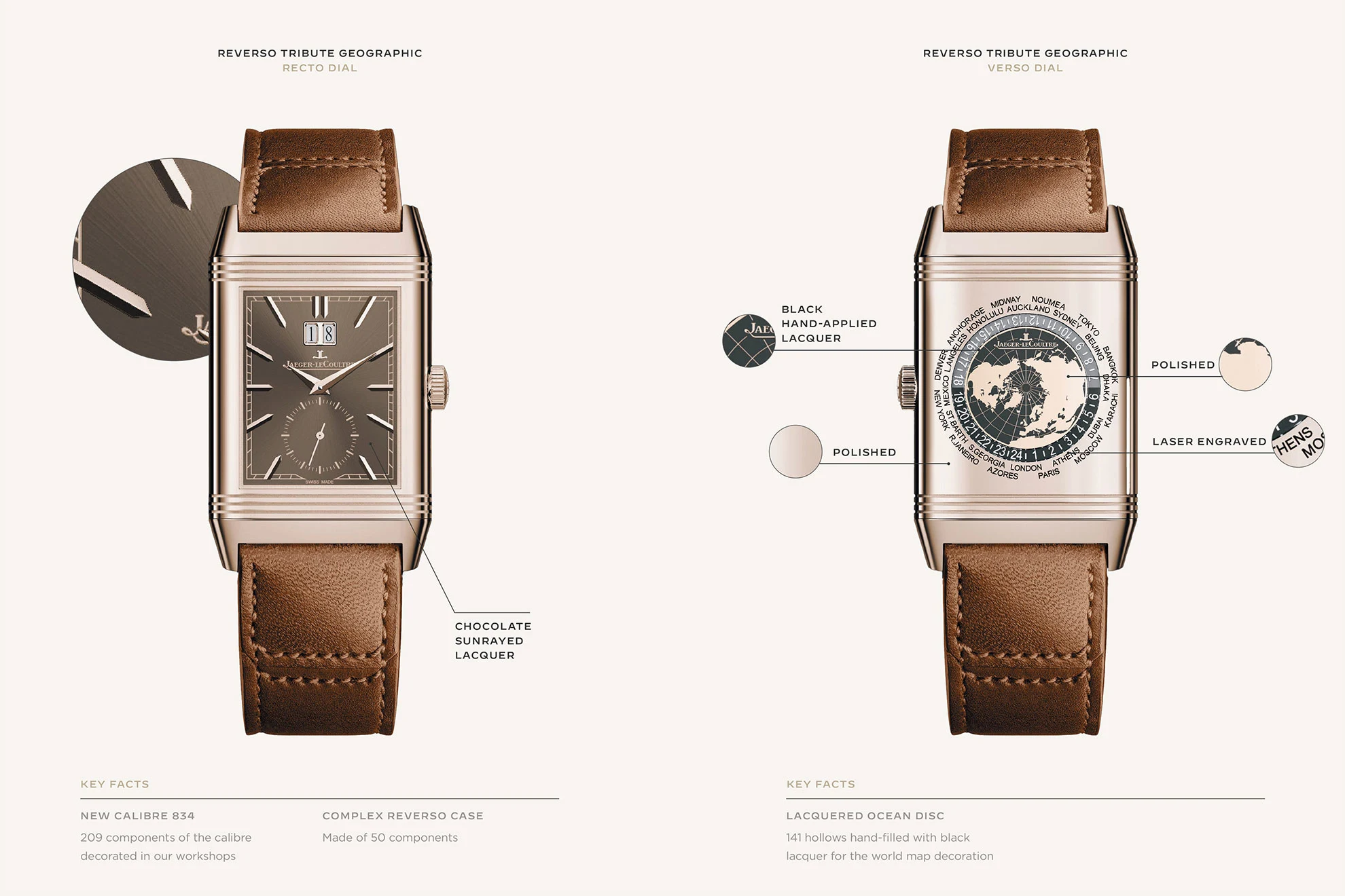 Over to another timepiece with a real wow factor, we have the Reverso Tribute Geographic, featuring an all-new movement, the calibre 834. This watch presents the classic travel time complication on a new steel or pink-gold model, with the complication appearing on the reverse.