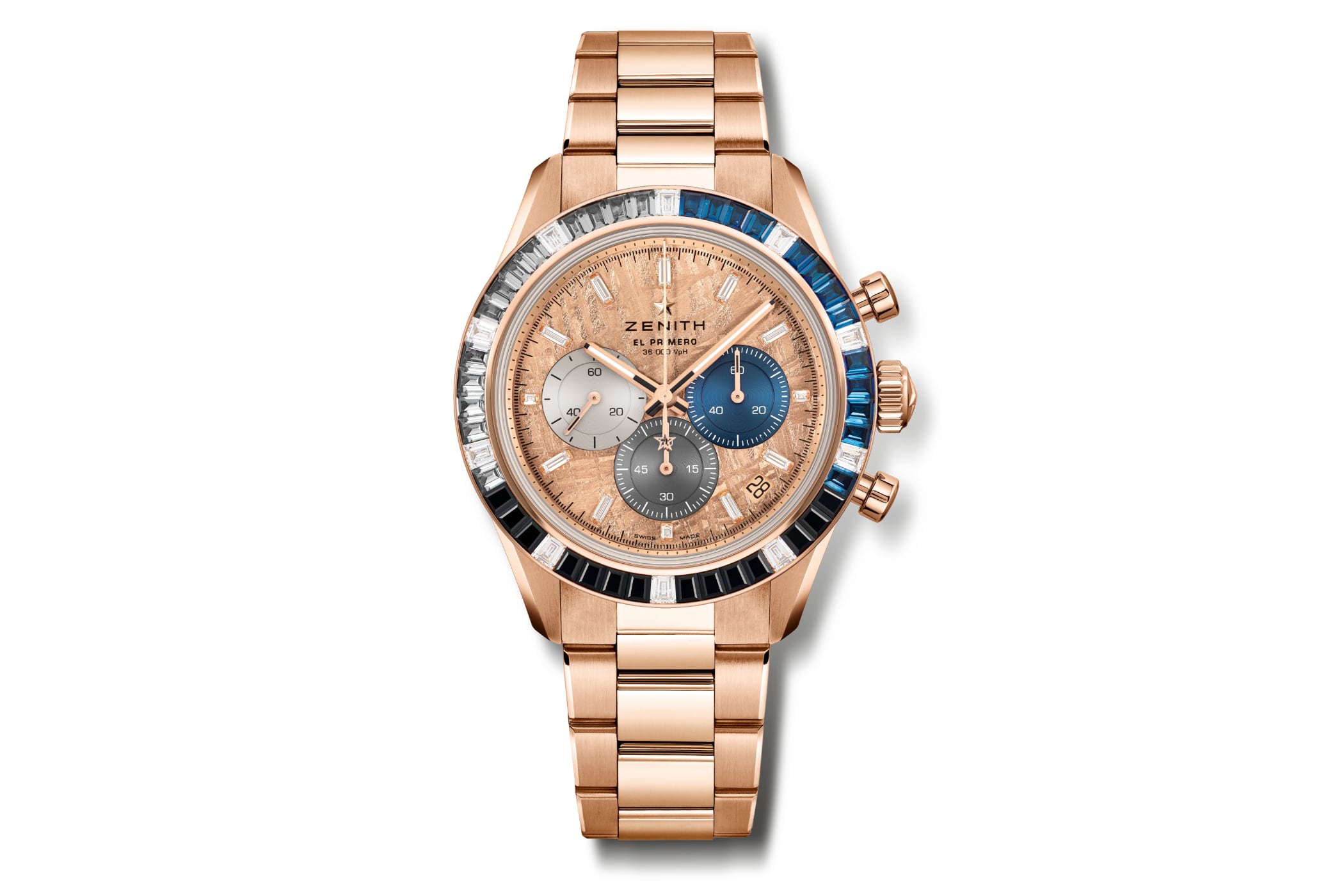 The case measures 41 mm and is of 18-carat rose gold. Notable features are the polished sides, a brushed front and unprotected pump pushers. The crown meanwhile bears the Zenith logo. The bezel is set with white baguette-cut diamonds, black spinels and grey and blue sapphires. The stones continue the colour theme of the three-colour chronograph counters, which harks back to the historic reference A386. Last but not least, the watch offers a transparent case back that allows a view of the movement. The water resistance is 100 metres.