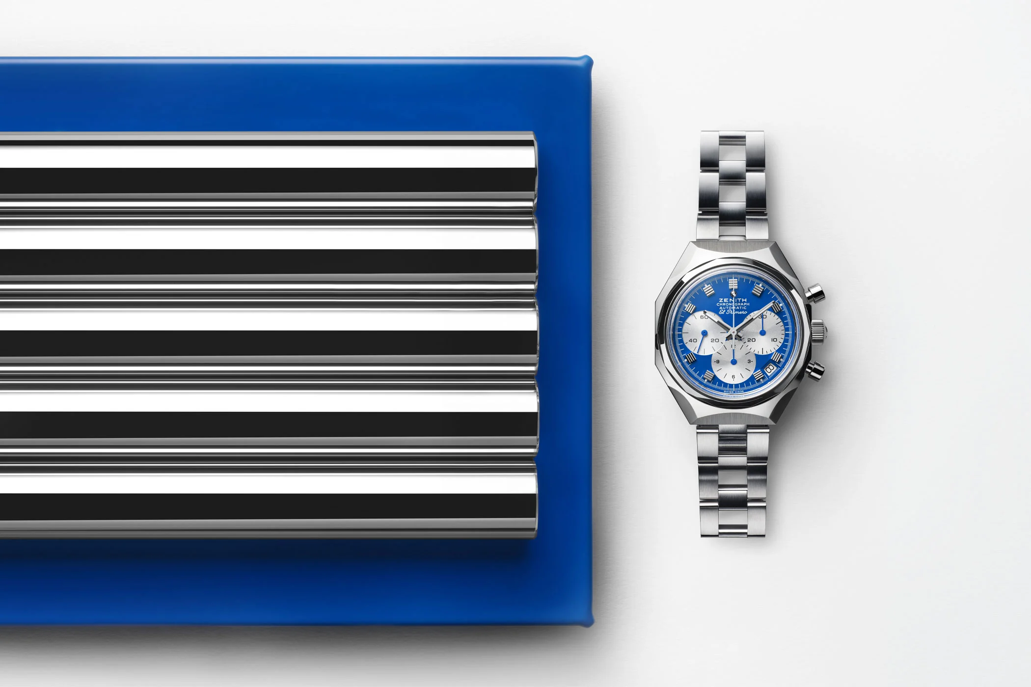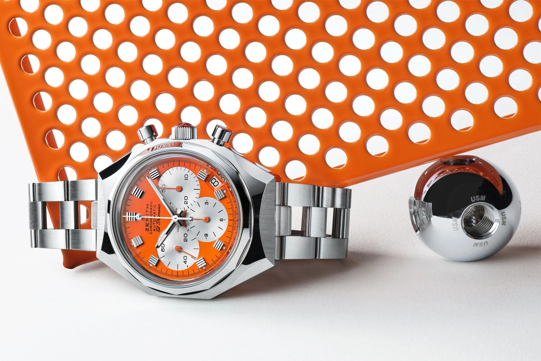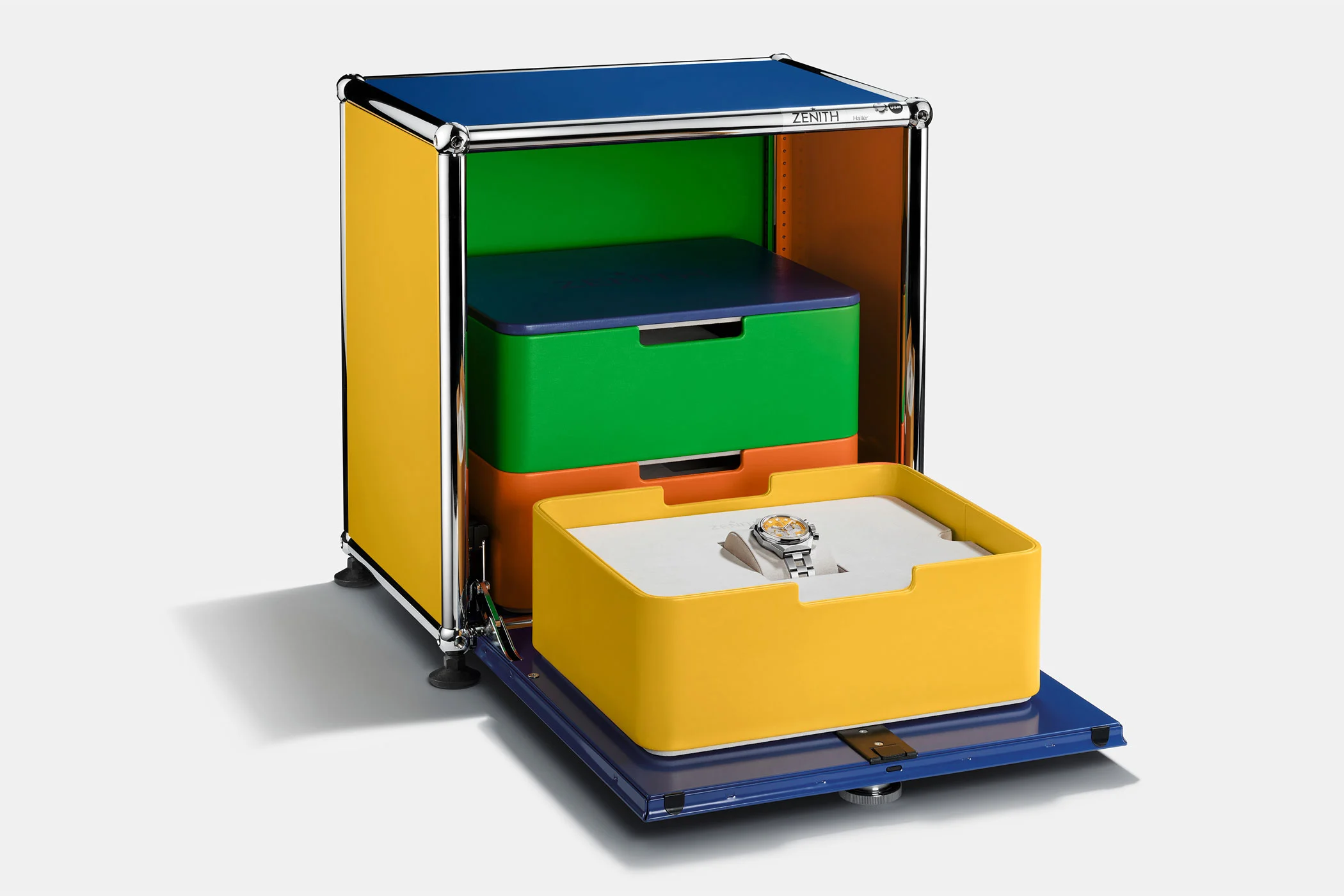 Zenith’s partner USM is the family-owned company Ulrich Schärer Munsingen, named after its founder and place of origin. It established itself through the famous and still successful USM Haller modular furniture system in 1965, designed by architect Fritz Haller. Just four years later, Zenith launched the legendary high-frequency chronograph calibre El Primero. Two stunning design classics from a single decade.