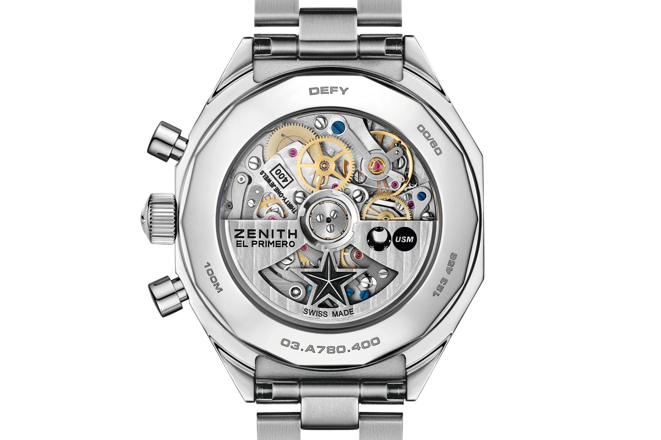 The original Defy has been reissued in many variations over the years, but never as a chronograph – until now. The new Defy Chronograph USM changes that, powered by the El Primero 400, renowned for its high-frequency performance. This 5-hertz automatic movement (36,000 vibrations per hour) delivers a 55-hour power reserve and supports hours, minutes, small seconds, stop function, and date. Its finishing details include Côtes de Genève guilloché engraving, along with the engraved logos of both Zenith and USM on the rotor.