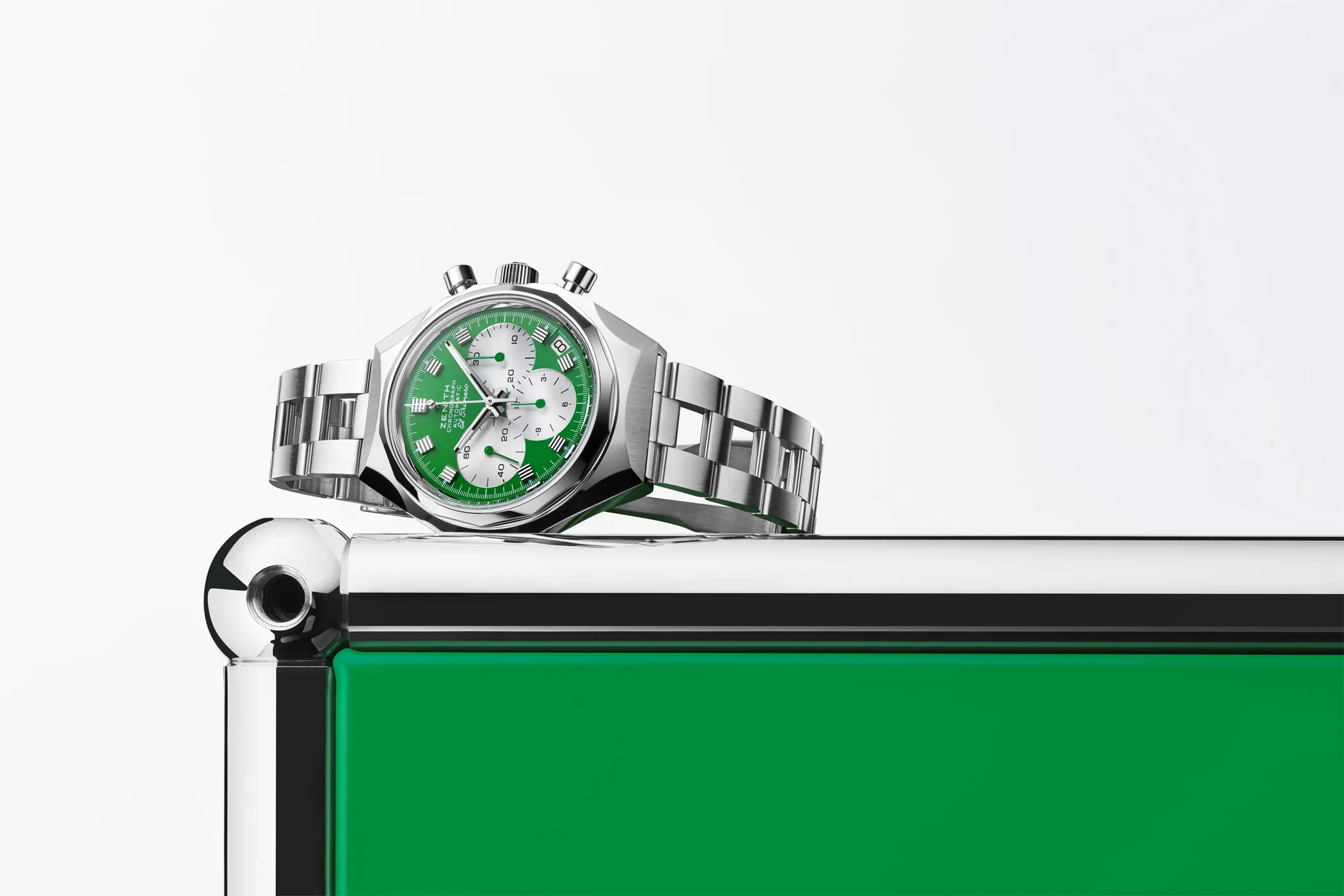 The current fusion of furniture and watch concepts for Zenith’s 160th anniversary year culminates in a stainless steel case with a compact 37.3-millimetre diameter that is water-resistant to 10 bar. Furthermore, the case features the typically striking Defy geometry: an octagonal shape with a fourteen-sided bezel, which is complemented by pump-style chronograph pushers.