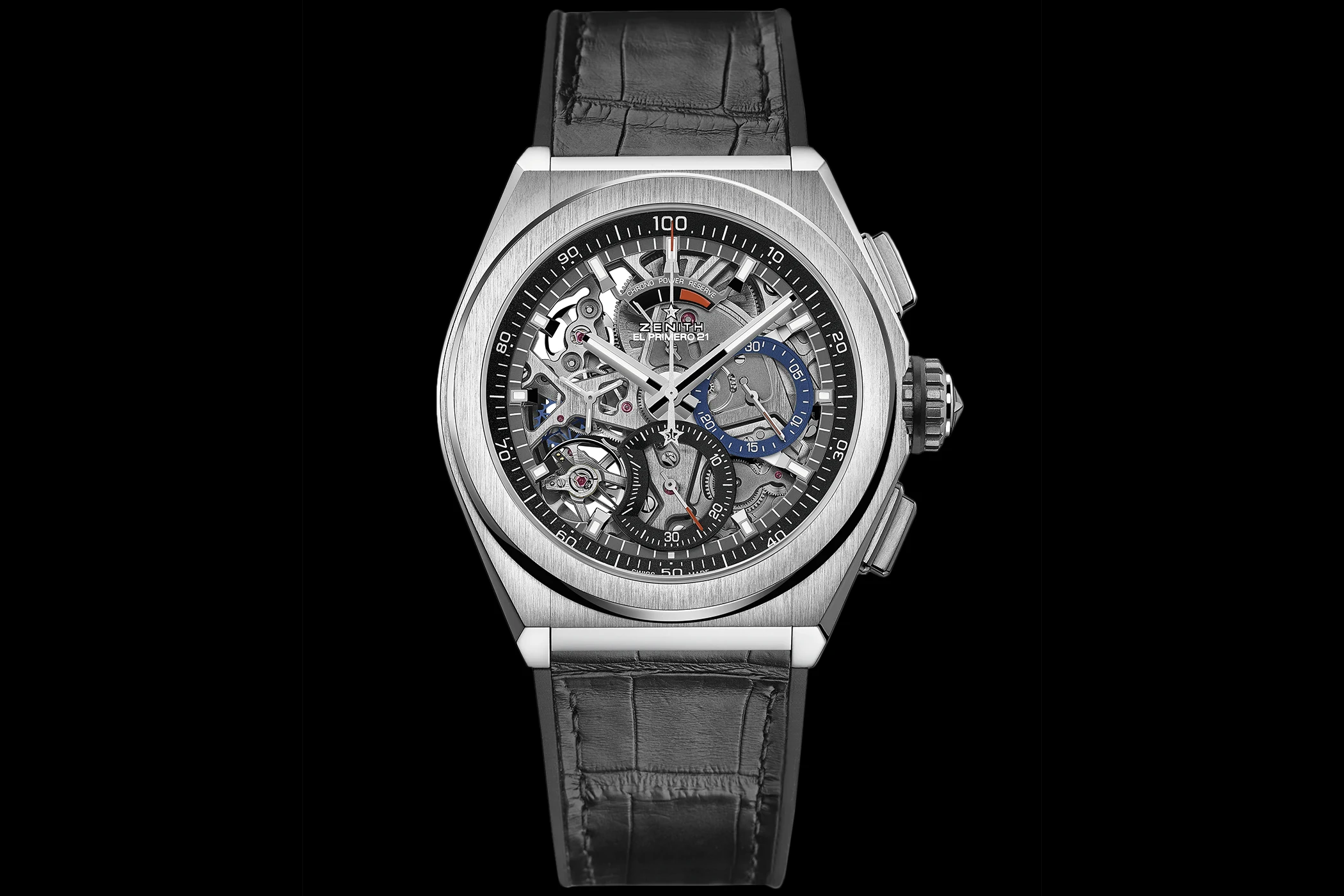 In terms of design, Zenith showcases the timepiece’s mechanics to maximum effect. The mainplate and bridges are coated in blue PVD, with rhodium-plated and bevelled edges. Added to this are two striking, architecturally styled bridges at 10 and 2 o’clock, which further structure the movement. The Zenith star is integrated directly into the openwork construction, with the tourbillon forming its visual focal point. The watch thus derives its appeal less from a classic dial than from its constructed, almost graphic effect.