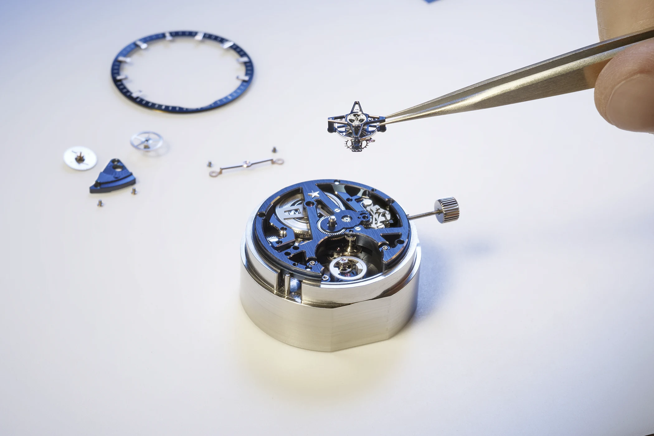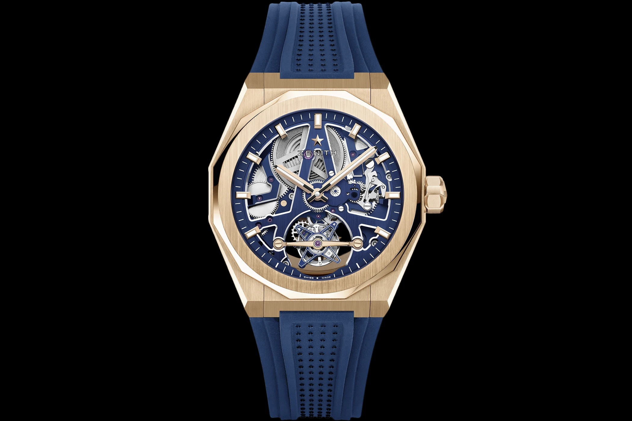 The key specifications are easy to summarise: the case measures 41 millimetres in diameter, is water-resistant to 10 ATM (100 m), and is crafted entirely from rose gold. The timepiece also comes with a blue rubber strap featuring a star pattern and a rose gold folding clasp. At the heart of the watch is the El Primero 3630 SK, a skeletonised automatic movement with a frequency of 5 Hz (36,000 vibrations per hour), a 50-hour power reserve, and a one-minute tourbillon at 6 o’clock. The tourbillon cage alone is assembled from 56 individual parts, and the rotor of the automatic calibre is crafted from solid gold.