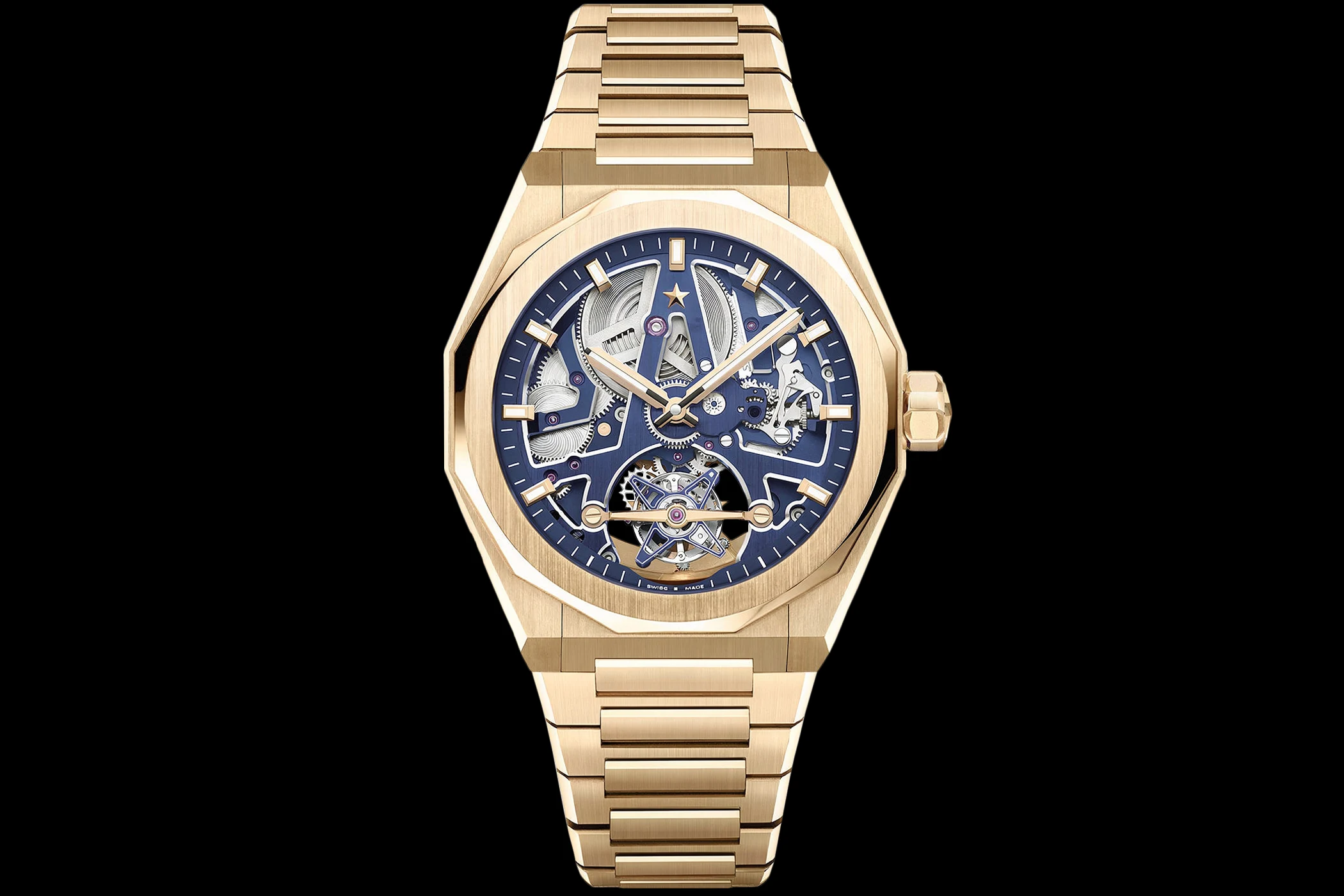 The most significant step for the current Defy Skyline Tourbillon came in 2022 with the launch of the Defy Skyline. It was here that the Defy acquired the basic design it retains to this day. Zenith introduced a modern integrated sports watch featuring a faceted case architecture, a striking polygonal bezel, and a star-patterned dial. Above all, however, this marked the debut of the El Primero 3620 calibre with its characteristic 1/10-second display at 9 o’clock, which is driven directly by the 5 Hz escapement and completes one rotation every ten seconds. It was precisely this detail that made it clear that Zenith did not view the Skyline as a mere design line, but as a fundamental form with clear El Primero DNA.