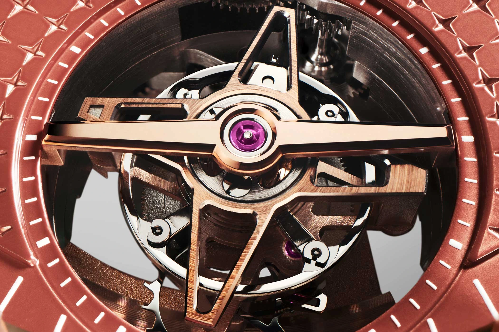 For the decorations, the designers took their inspiration from the star-shaped geometry of the dial and also engraved 3D Geneva stripes, which draw the eye to the pulsating heart of the watch – the tourbillon. Rose gold is also used in the mechanical inner workings, namely in the rotor in the form of a skeletonised star – a first for the Defy Skyline.