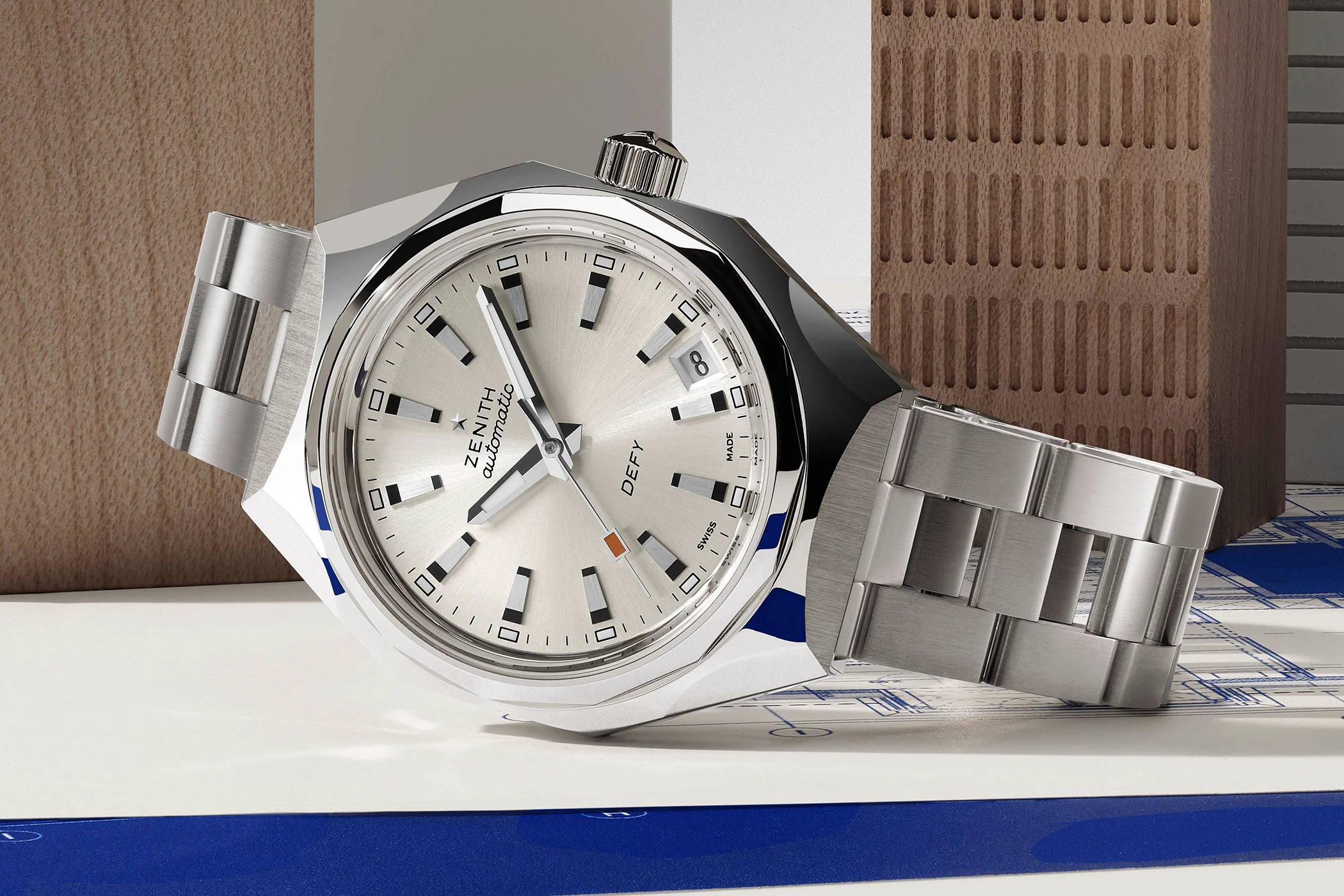 On the silver-toned dial, finished with a sunray pattern, Zenith remains meticulously faithful to the original design, while translating it into a modern aesthetic through contemporary materials and manufacturing techniques. The applied hour markers feature a two-tier profile, combining a satin-finished central section with glossy, black-lacquered recesses, and are framed by rectangular blocks filled with luminous material. Faceted hands rise from the centre, while the seconds hand—just as on the historic model—is accented with a bright orange rectangular tip. The Defy Revival A3643 is available immediately from Zenith boutiques, online stores and authorised retailers worldwide, priced at EUR 7,900.