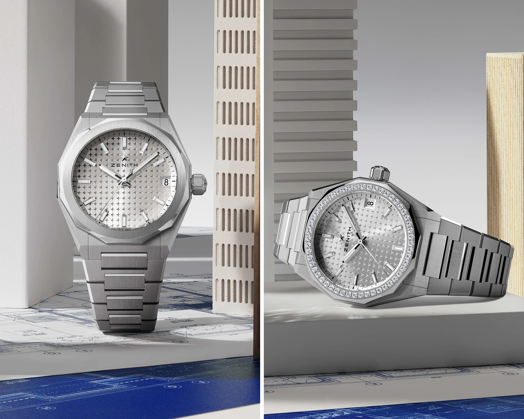 The Defy Skyline collection, first introduced to Zenith’s product portfolio in 2022, records the largest number of new additions. Leading the way is the Defy Skyline in 36 mm, a unisex model that was originally offered in dark blue, ice blue, pastel green and pastel pink. The latest expansion comprises two new versions, both featuring a silver-toned dial adorned with a star pattern. Each is housed in a 36 mm stainless-steel case and powered by the Elite 670 movement. This automatic calibre operates at a frequency of 28,000 vibrations per hour (4 Hz) and provides a power reserve of 50 hours. Turning from the similarities to what distinguishes the two models, the key difference lies in the bezel. One version is set with 52 brilliant-cut diamonds with a total weight of approximately 1.00 carat. The model without a gem-set bezel is priced at EUR 9,500, while the version with diamond-set bezel is available for EUR 13,500.