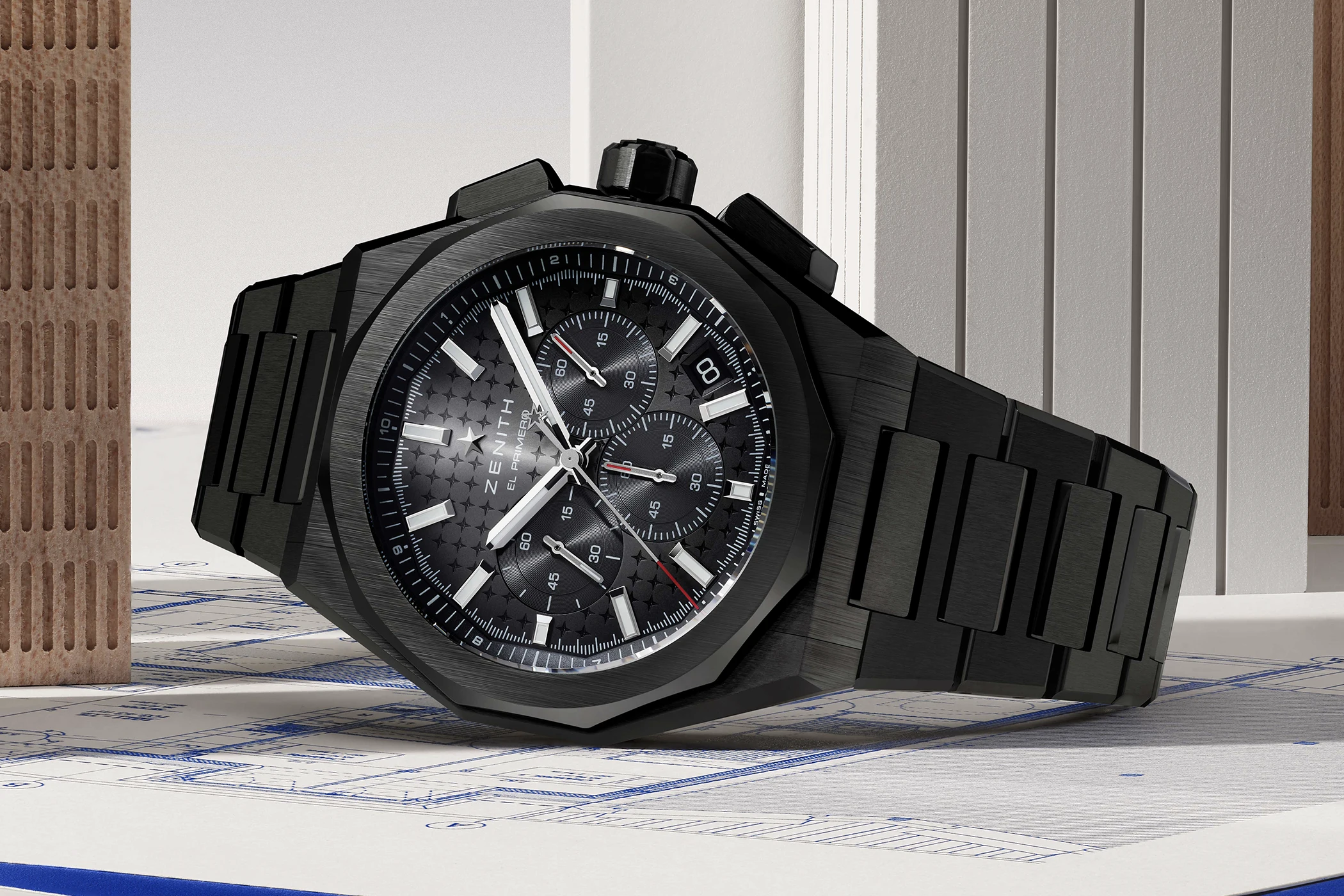 The second model with a black ceramic case is the Defy Skyline Chronograph, an automatic column-wheel chronograph powered by an El Primero movement and capable of measuring and displaying elapsed time to an accuracy of one-tenth of a second. In 2025, the model was first presented as an all-ceramic trio in shades of blue to mark the manufacture’s 160th anniversary. This time, the timepiece is housed in a 42 mm black ceramic case with water resistance of up to 100 metres. The dial, engraved with a pattern of four-pointed stars, echoes the dark tone of the case around its periphery and gradually transitions to a lighter shade towards the centre. Integrated into the dial are three sub-dials: a 60-second counter at 3 o’clock, a 60-minute counter at 6 o’clock, and a small seconds display at 9 o’clock. A date window is positioned between them at 4:30.
