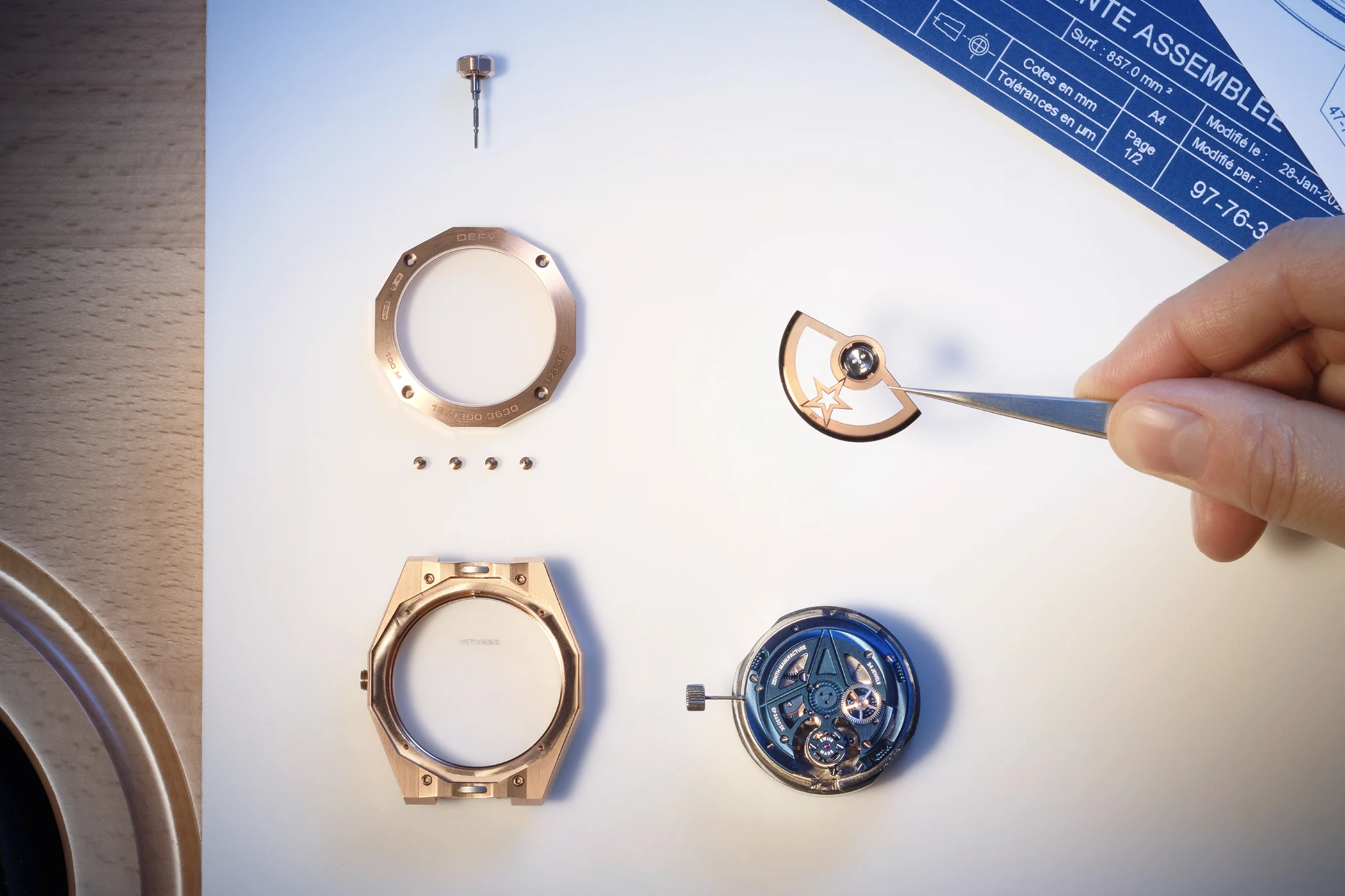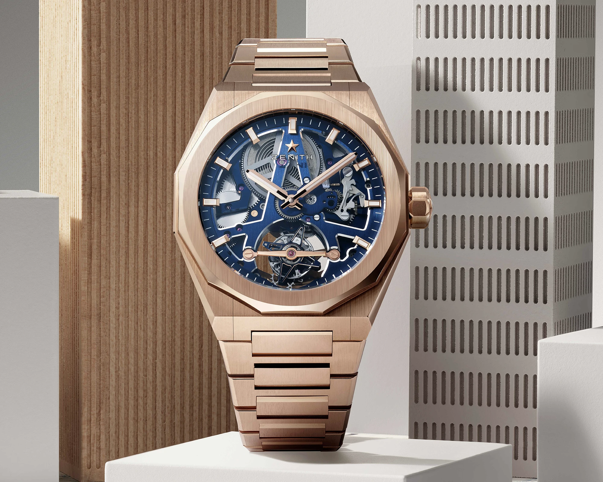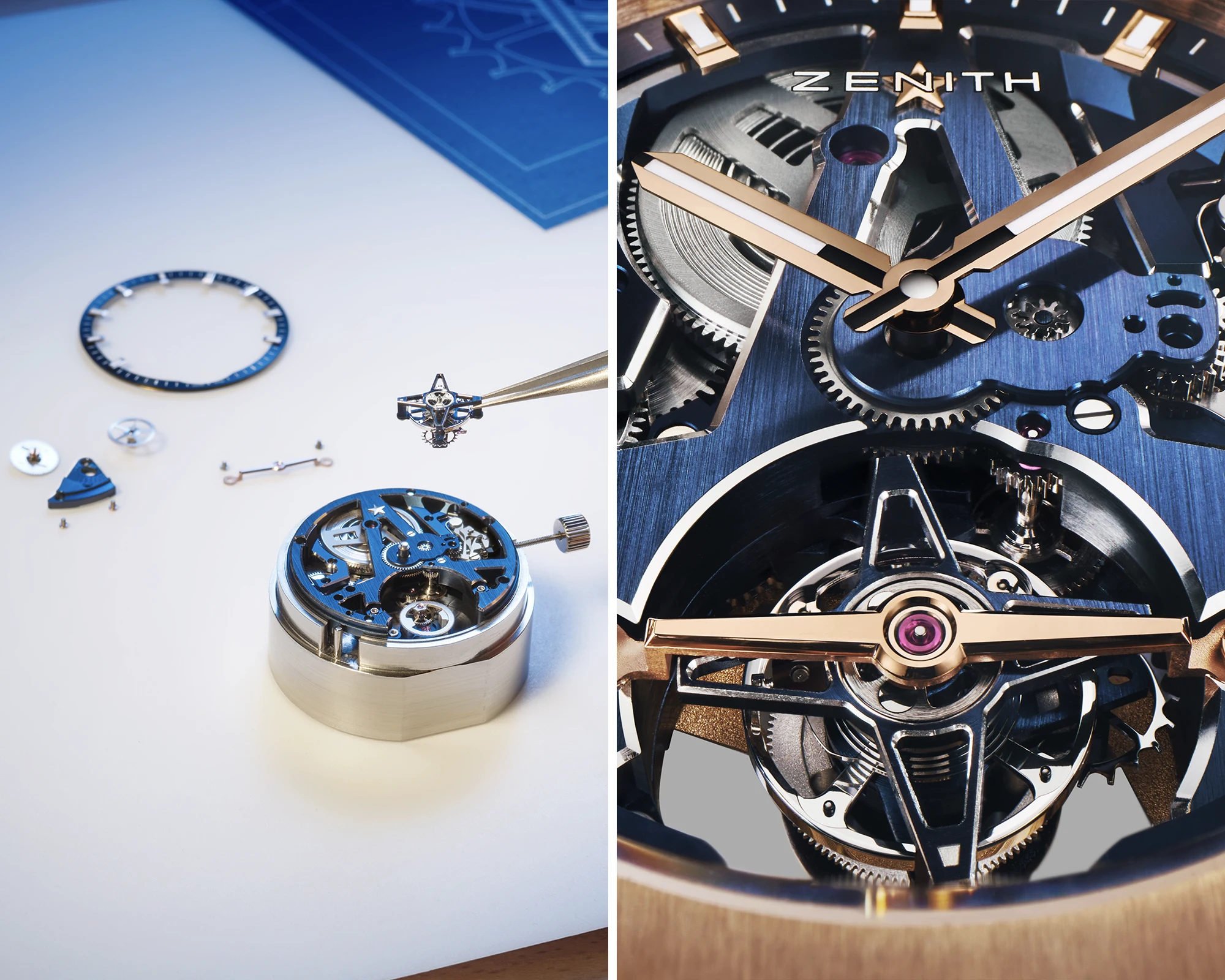 The tourbillon itself completes one full rotation on its axis every minute. It is mounted on the dial side beneath a rose-gold bridge and operates at a frequency of 36,000 vibrations per hour (5 Hz), while its cage is composed of 56 individual components. The tourbillon is positioned within the opening of a stylised Zenith star, whose bridges taper to a point towards 12 o’clock to form a single ray. This ray in turn supports the solid gold hour and minute hands, which are filled with Super-LumiNova. On the dial side, the movement is framed by a peripheral chapter ring that carries the hour markers.